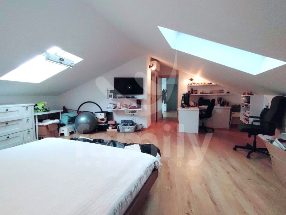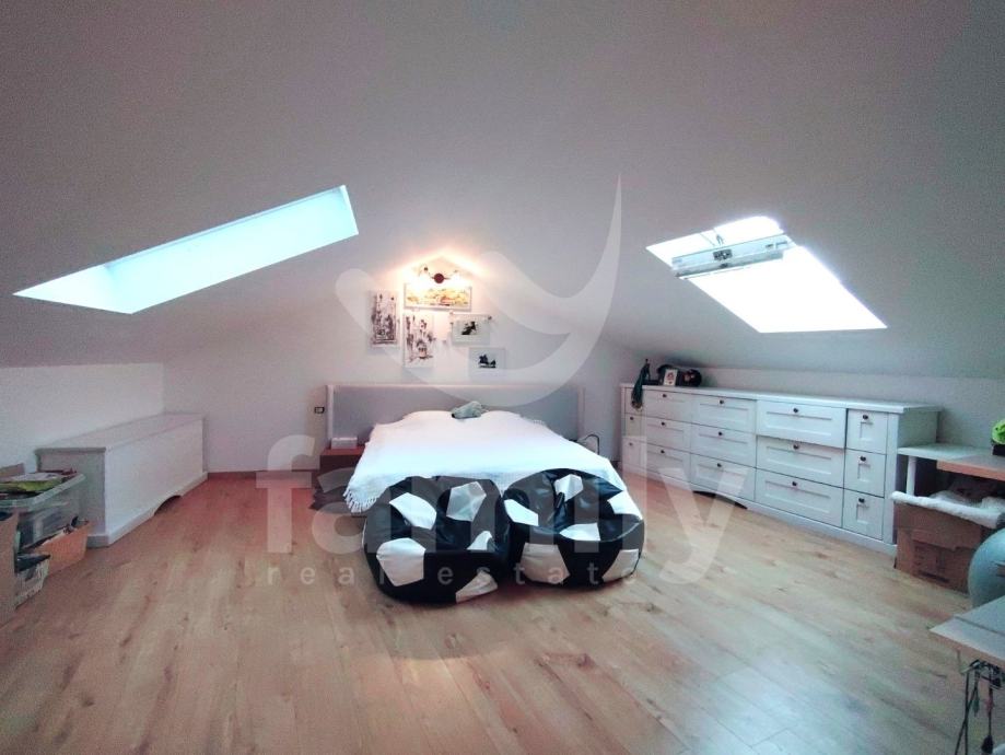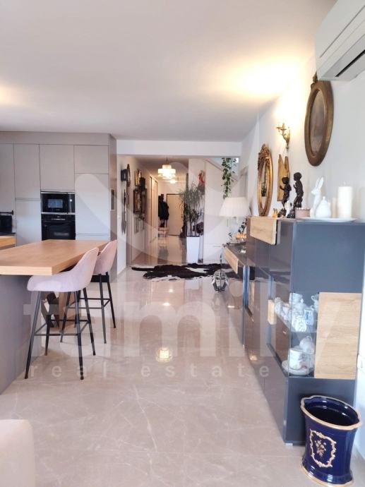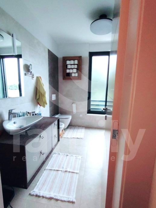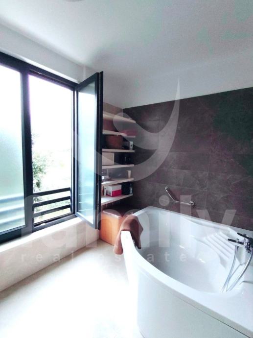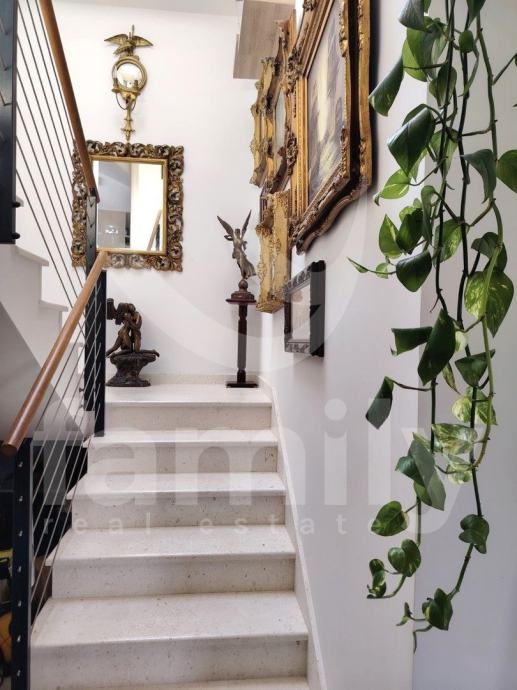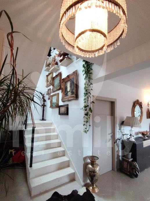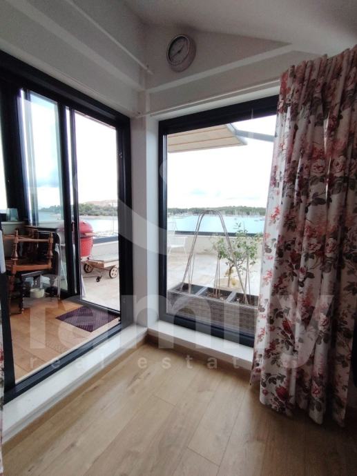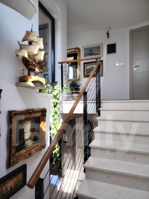 U nekretnini se nalaze kamene stepenice koje vode na drugu etažu gdje su smještene dvije spavaće sobe od kojih jedna soba ima izlaz na terasu također sa pogledom na more, prekrasna terasa koja je u staklu sa zapanjujučim pogledom pretvorena u konobu sa kaminom. Ova prekrasna nekretnina ima aluminijske troslojne stijene, centralno podno grijanje na struju, klima jedinice, termo fasada i A+ energetski certifikat. Stanu pripadaju dva parkirna mjesta, jedno u garaži a drugo ispred zgrade koja posjeduje lift.