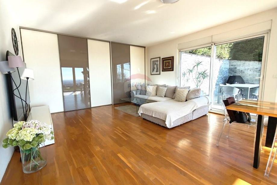 Velike staklene stijene u dnevnom boravku osiguravaju obilje prirodne svjetlosti tijekom cijelog dana, a stan krasi spektakularan, otvoren pogled na cijeli Zagreb.