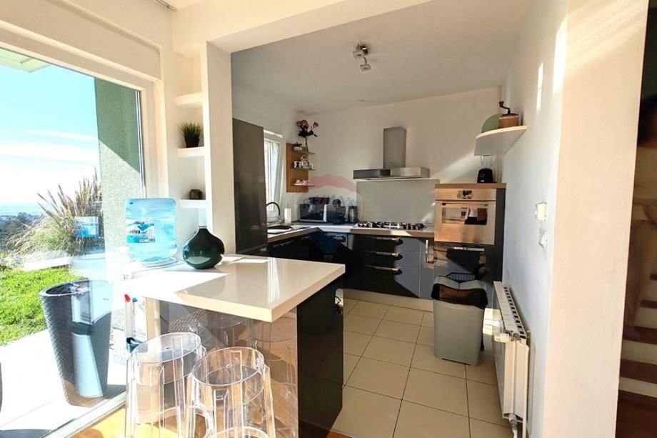 Stepenicama se spušta u donju etažu gdje se nalazi dodatni toalet te prostrani dnevni boravak povezan s kuhinjom u otvorenom konceptu. Iz dnevnog boravka izlazi se na prekrasnu terasu s roštiljem savršeno mjesto za druženja i uživanje na otvorenom.