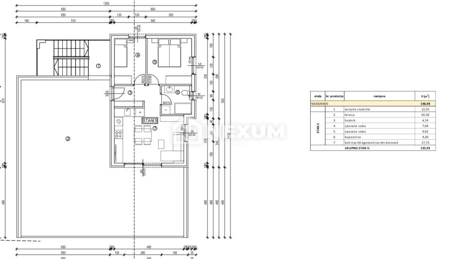 Na prodaju je dvosoban penthouse S5 na trećem katu zgrade ukupne korisne površine 135,93m2, od čega unutarnji dio stana ima površinu 43,36m2, dok površina terase iznosi 92,30m2.