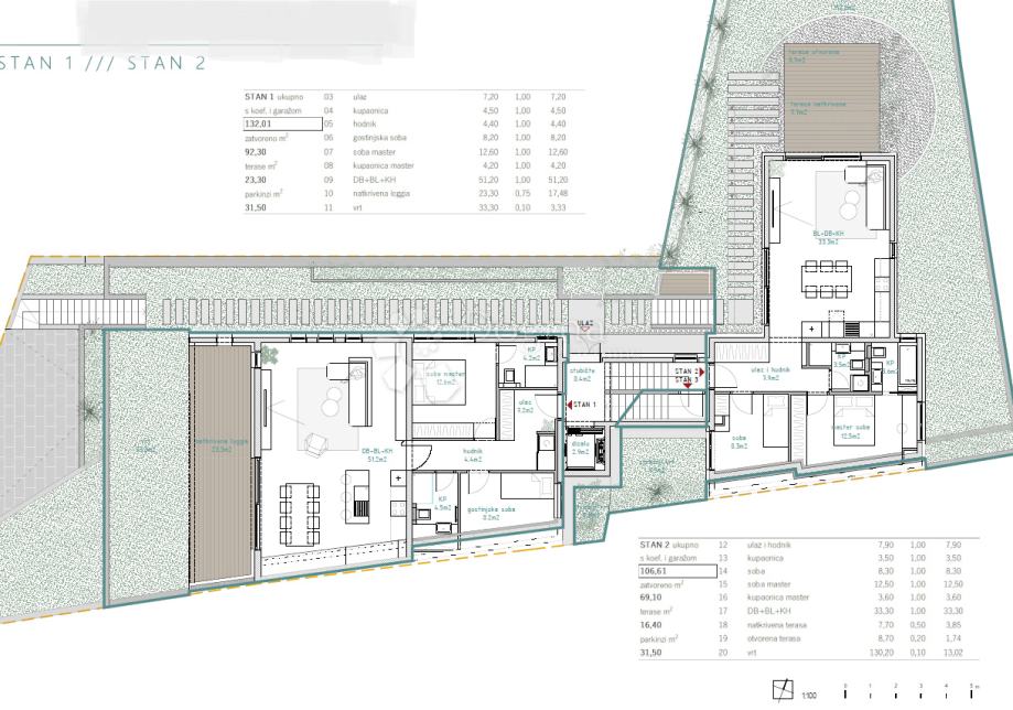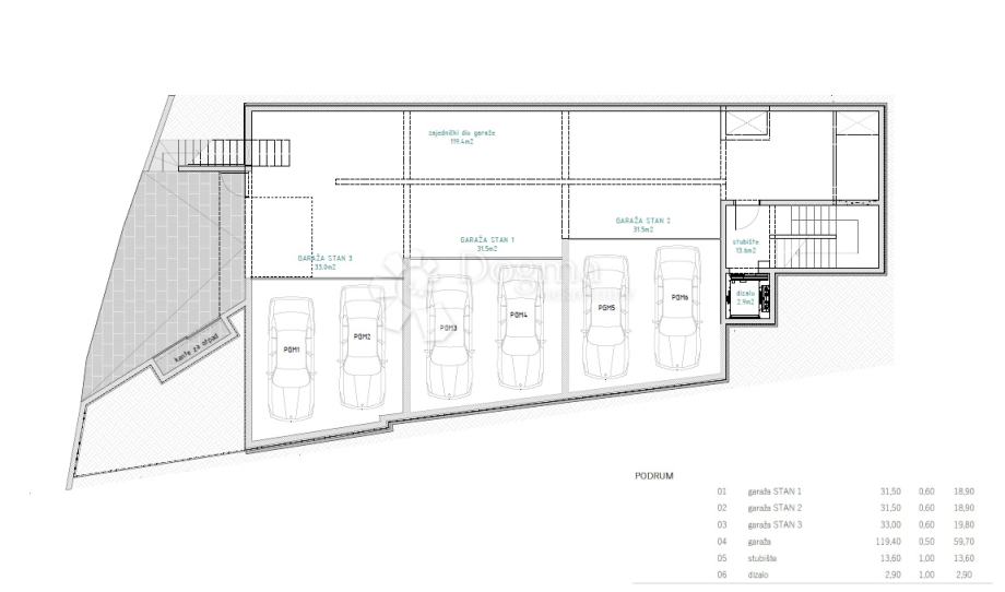 • Prizemlje: garažni prostor s ukupno 6 parkirnih mjesta