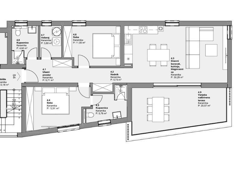Stan ukupne površine 90m2 sastoji se od dnevnog boravka spojenog s kuhinjom i blagovaonicom u tzv. otvoreni koncept veličine 30,29m2, dvije spavaće sobe, dvije kupaonice s toaletom, praonice te natkrivene terase veličine 20m2.