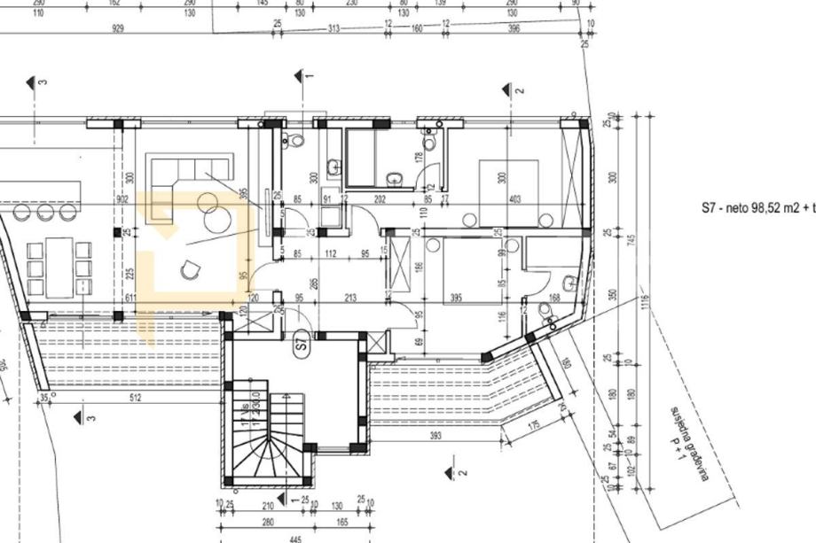 Penthaus se sastoji od dvije spavaće sobe, svaka sa svojom kupaonicom, WC-a za goste, te prostranog otvorenog prostora koji objedinjuje kuhinju, blagovaonicu i dnevni boravak u svijetlu i prozračnu cjelinu. Posebnu vrijednost pruža terasa površine 20,31 m², savršena za opuštanje i uživanje u panoramskom pogledu na more. Cijeli stan opremljen je podnim grijanjem, što osigurava maksimalnu udobnost tijekom cijele godine.