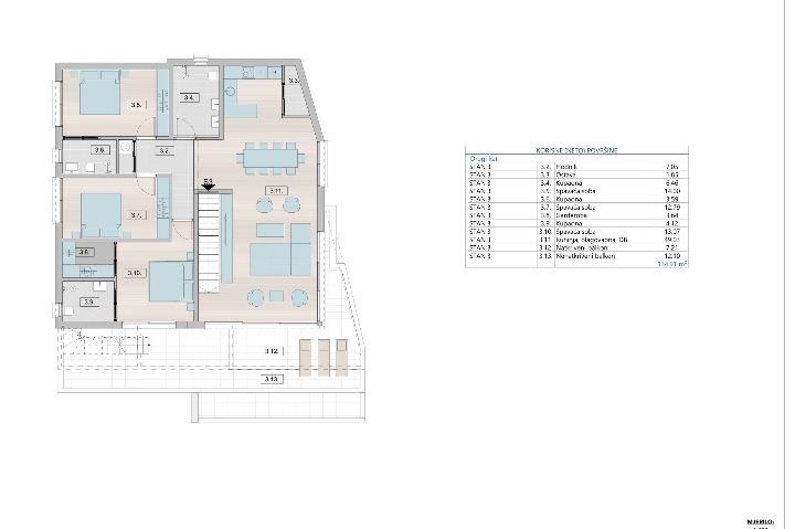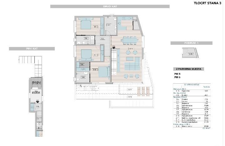 Stan je trosobni sa dnevnim boravkom , tri kupatila , ostavom , garderobom, kuhinjom, praonicom te dva balkona. Nalazi se na drugom katu te mu pripada krovna terasa od 89,68m2 za druženje i uživanje sa predivnim pogledom.