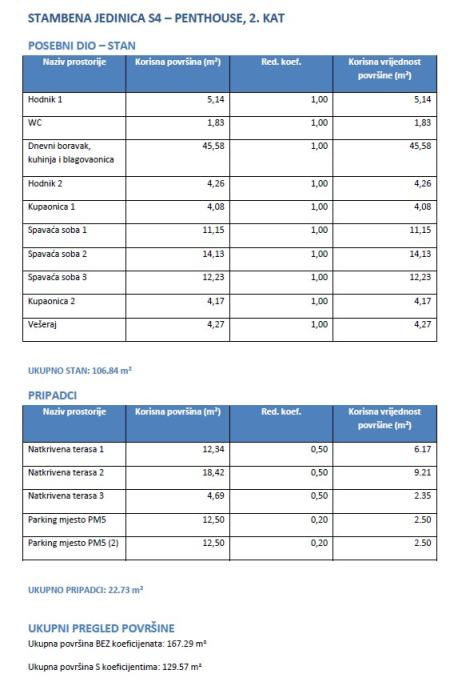 Stan ima 129,57 m2 neto korisne površine, a sastoji se od: