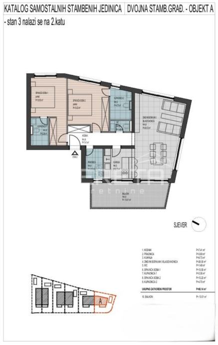 Stan S3A smješten je na 2. katu, stambene površine 80,14 m², s pažljivo osmišljenim rasporedom: hodnik, praonica, WC, 2 kupaonice, prostrani dnevni boravak i blagavaonica, kuhinja, 2 dvije spavaće sobe i balkon od 13,01 m² (koef. 0,50).
