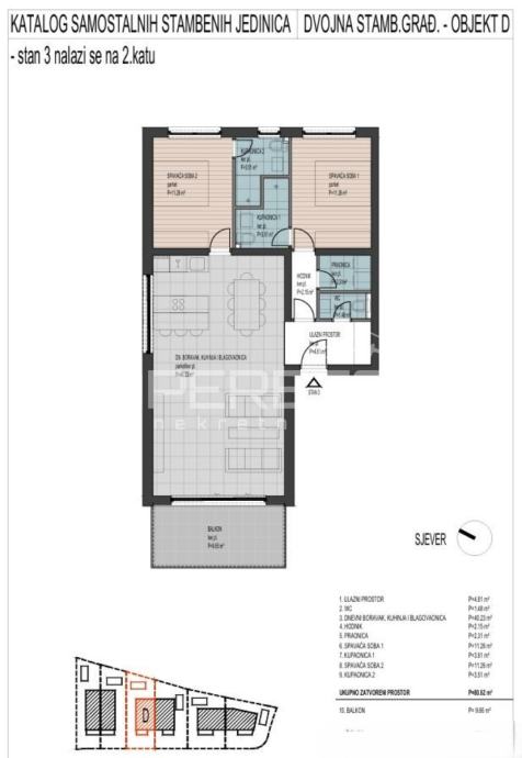 Stan S3D smješten je na 2. katu, stambene površine 80,62 m², s pažljivo osmišljenim rasporedom: hodnik, praonica, WC, 2 kupaonice, prostrani dnevni boravak i blagavaonica, kuhinja, 2 dvije spavaće sobe i balkon od 9,66 m² (koef. 0,50).