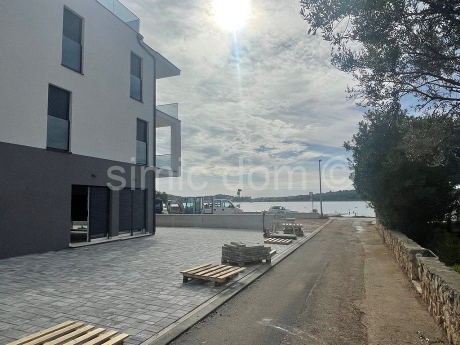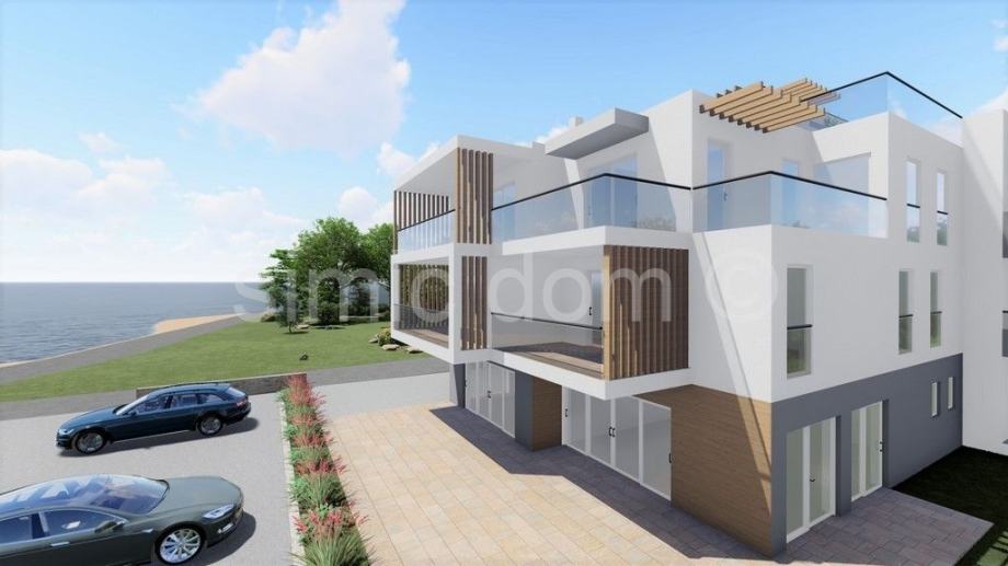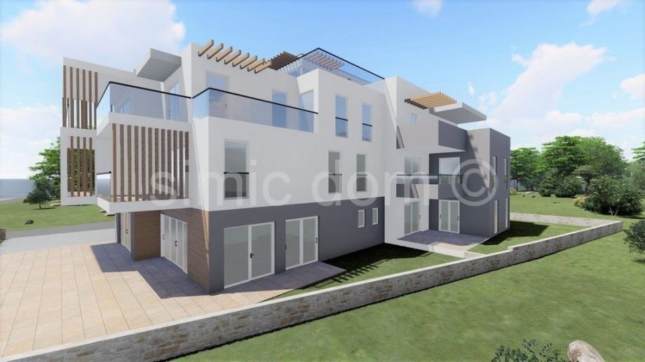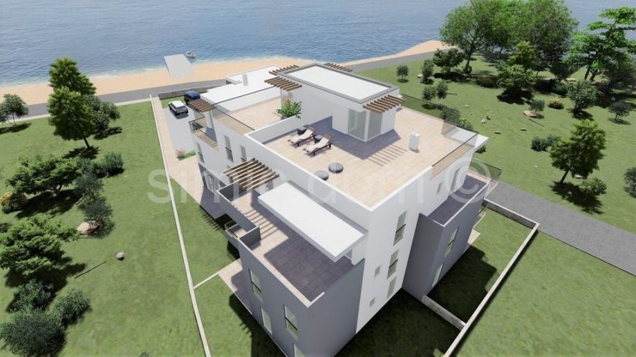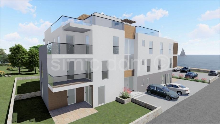 Na prodaju je spektakularan i luksuzni penthouse apartman u prvom redu do mora u Srimi. Apartman ima ukupnu neto površinu od 184m2 - 254m2 korisne površine, odnosno 94m2 unutarnjeg prostora. Apartman ima čak tri terase od kojih je jedna krovna terasa sa spektakularnim panoramskim pogledom na cijelu okolinu. Apartman se sastoji od hodnika, tri spavaće sobe, dvije kupaonice i dodatnog WC-a, velikog dnevnog dijela otvorenog koncepta sa kuhinjom i blagovaonicom. Apartmanu pripada i parkirno mjesto uključeno u cijenu, a kupac ima mogućnost nadoplatiti za još jedno parkirno mjesto. Projekt će biti spoj luksuza i visoke kvalitete, uz opremu kao što su elektro-rolete, tri jedinice klima uređaja, senzori za dim. Useljenje je planirano do ljeta 2023. godine.