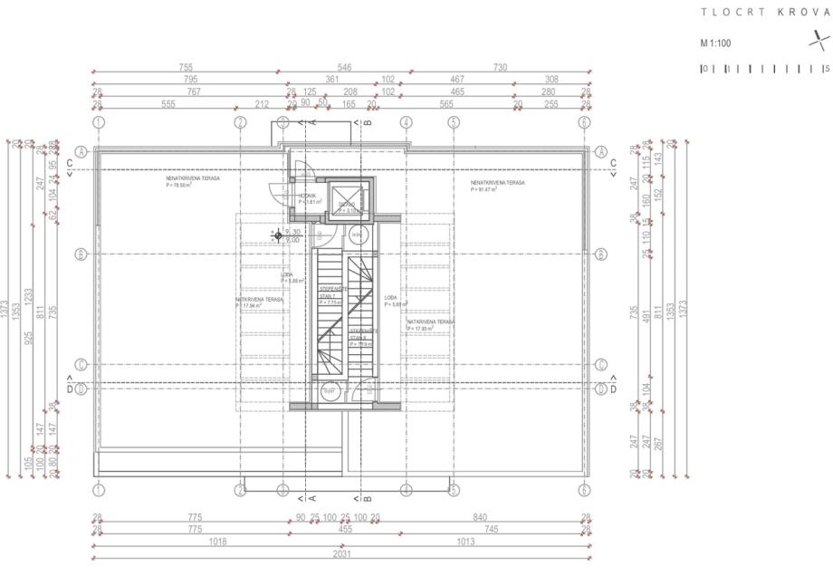 Dnevni boravak i blagovaonica povezani su s terasom preko velike staklene klizne stijene koja nudi neometan pogled na more. Unutarnjim stubištem vodi se na krovnu terasu od približno 100 m2, gdje će se nalaziti grijani bazen i prostor za vanjsku kuhinju. Neto korisna površina stana s terasama iznosi 98,36 m2, dok ukupna neto površina s pripadajućim prostorijama iznosi 141,75 m2.