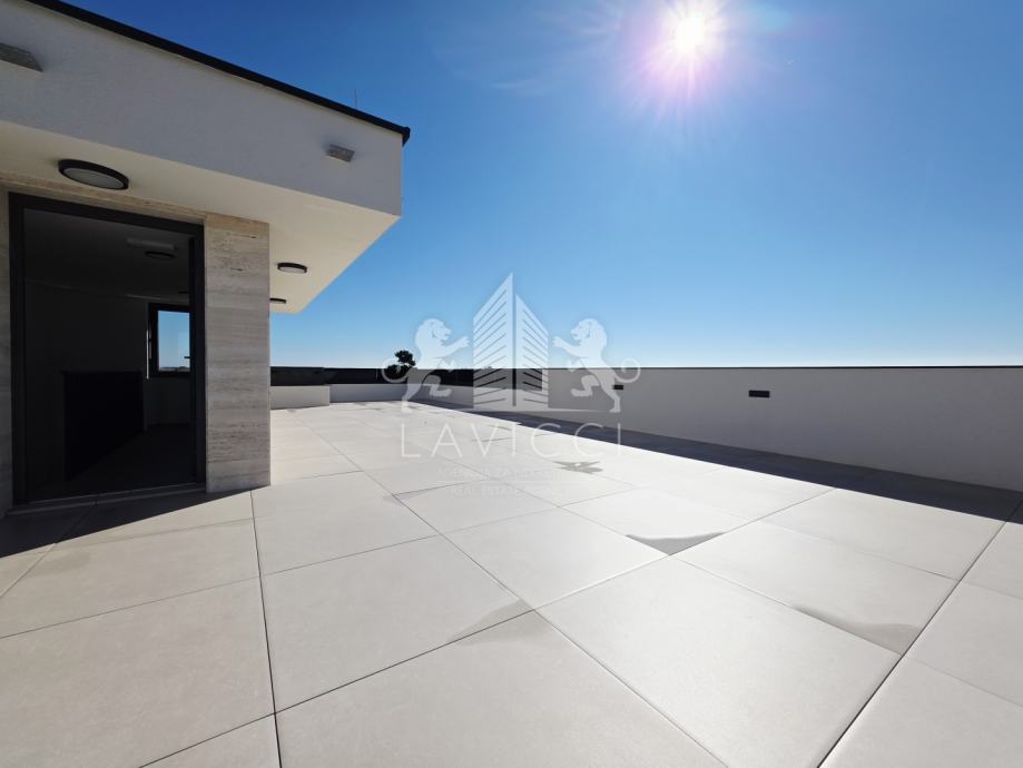 Krovna terasa zamišljena je kao vanjski dnevni prostor i izvedena je s travertino kamenom, koji značajno podiže estetsku vrijednost i dodatno modernizira cijeli objekt, dajući mu luksuzan i suvremen izgled. Na terasi se nalazi natkriveni dio predviđen za ljetnu kuhinju, čime je omogućeno ugodno korištenje prostora tijekom cijelog dana, a izvedene su i instalacije za jacuzzi, što dodatno naglašava ekskluzivni karakter ovog penthouse apartmana na Viru. Velika površina terase omogućuje uređenje zona za sunčanje, druženje i opuštanje uz potpunu privatnost. Apartmanu pripadaju i dva vanjska parkirališna mjesta, što je iznimna prednost za nekretninu u blizini mora i centra.