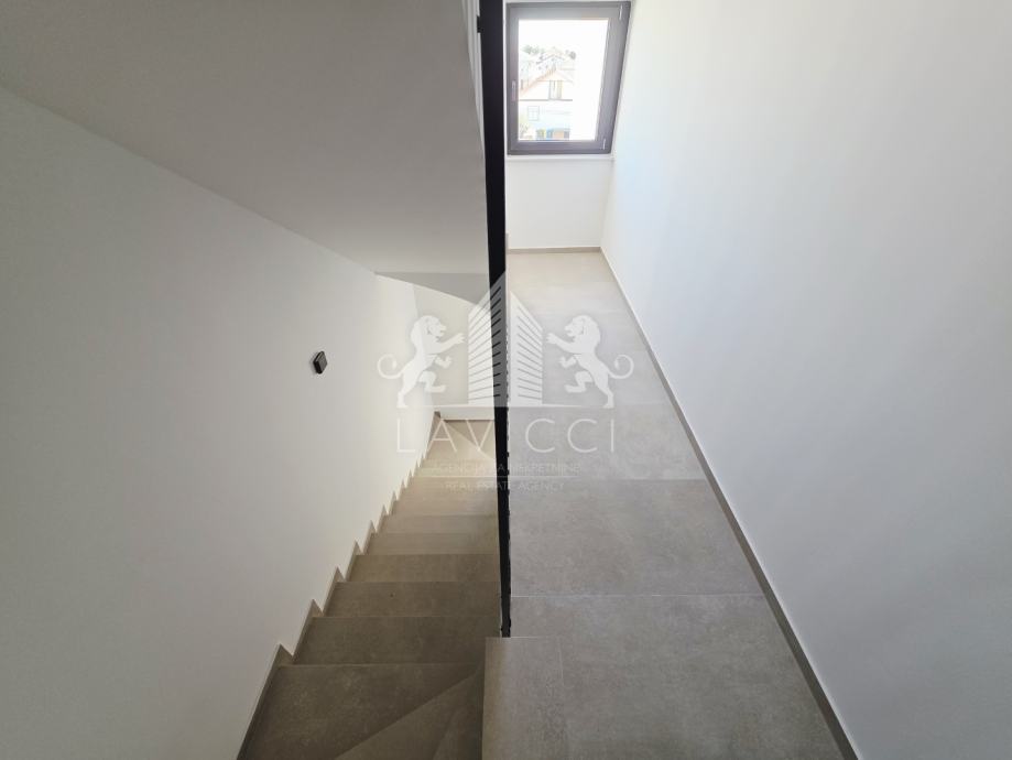 Riječ je o novogradnji na Viru visoke kvalitete, građenoj ciglenim termo blokom uz 10 cm toplinske izolacije fasade, što osigurava energetsku učinkovitost i ugodan boravak tijekom cijele godine, uz očekivani energetski certifikat A. U cijelom apartmanu postavljena je keramika velikog formata 90 × 90 cm, koja dodatno naglašava moderan i luksuzan karakter prostora. Kupaonice su opremljene vrhunskom sanitarijom renomiranih proizvođača Geberit, Grohe i Aquaestil, a kompletni kupaonski namještaj rađen je po mjeri, čime se postiže visoka razina funkcionalnosti i estetike. Stan je dodatno opremljen PVC stolarijom s troslojnim staklom, električnim roletama i komarnicima, klima uređajima u dnevnom boravku i spavaćim sobama te električnim podnim grijanjem u kupaonicama. Protuprovalna i protupožarna ulazna vrata, video portafon te LED rasvjeta u interijeru, na terasama i krovnoj terasi dodatno naglašavaju moderan, siguran i reprezentativan karakter ove nekretnine.