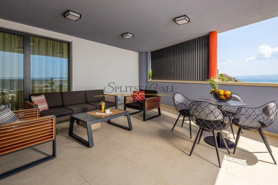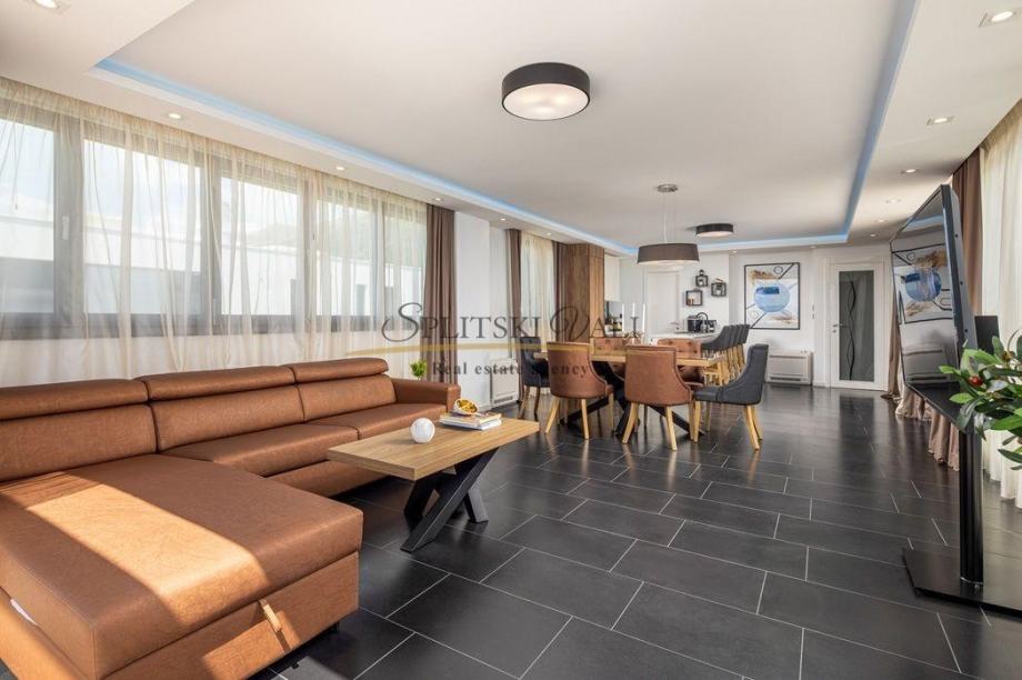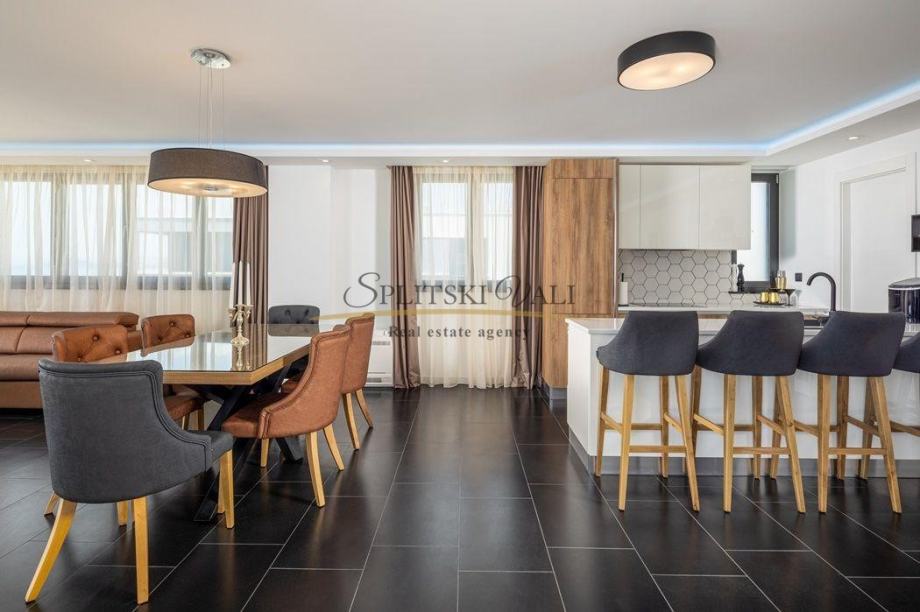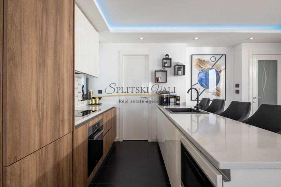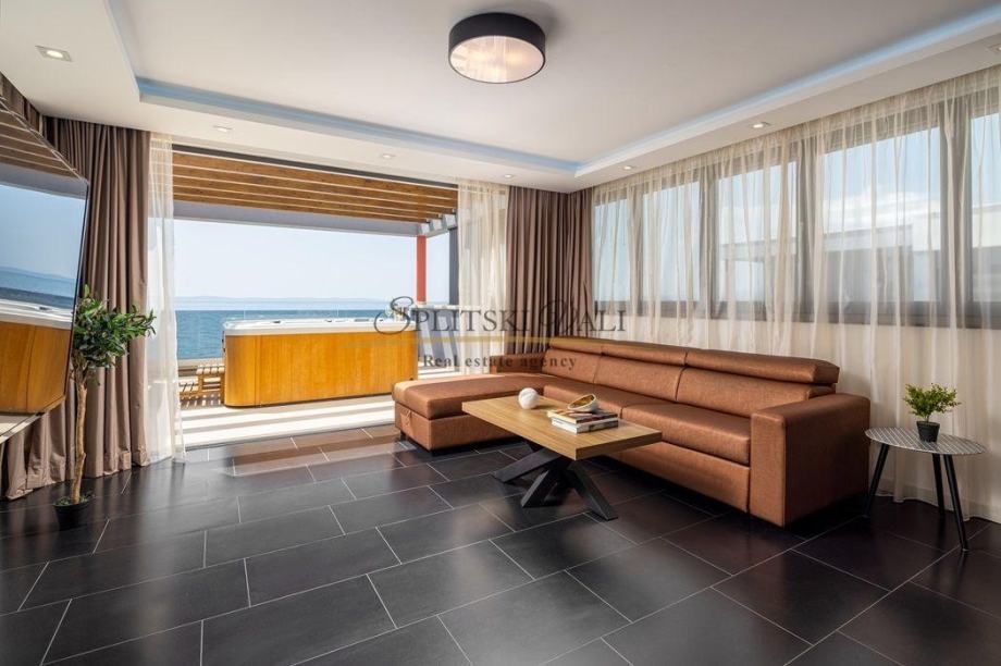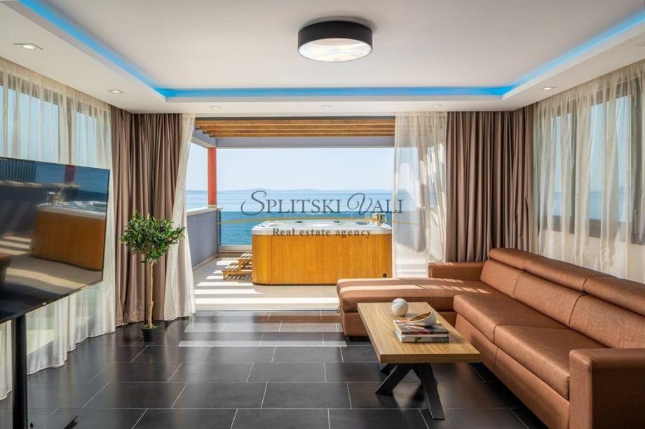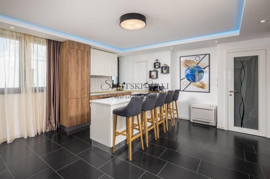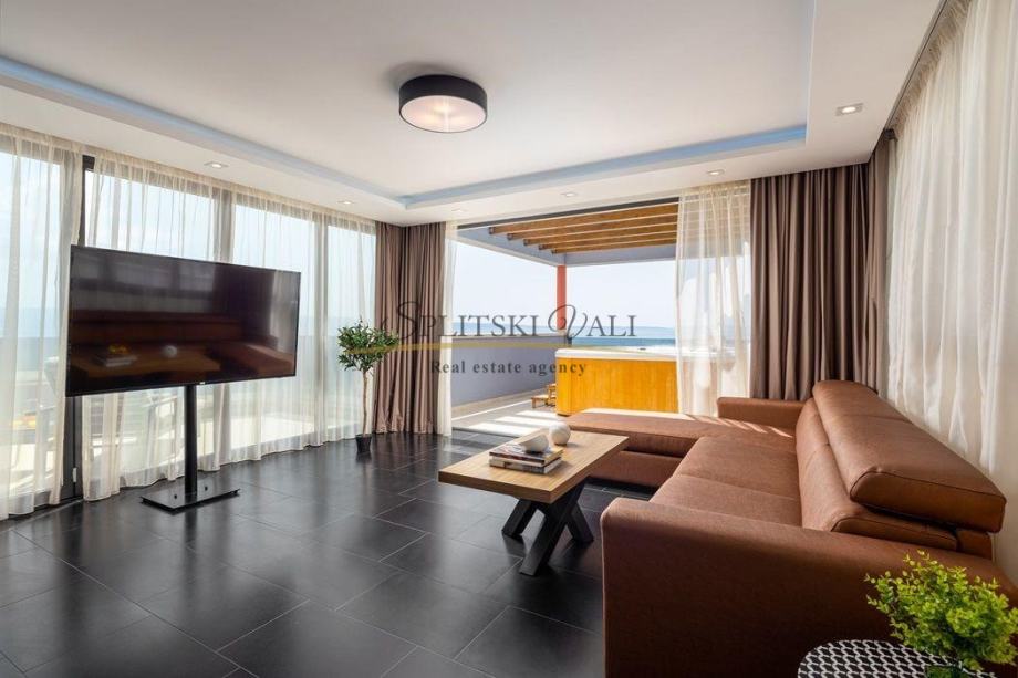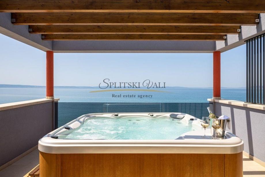 Stan se prostire na 120m2 i sastoji se od kuhinje s blagovaonom, dnevnog boravka, tri spavaće sobe (svaka sa kupatilom) i terase s jacuzzijem i prekrasnim, otvorenim pogledom na more.