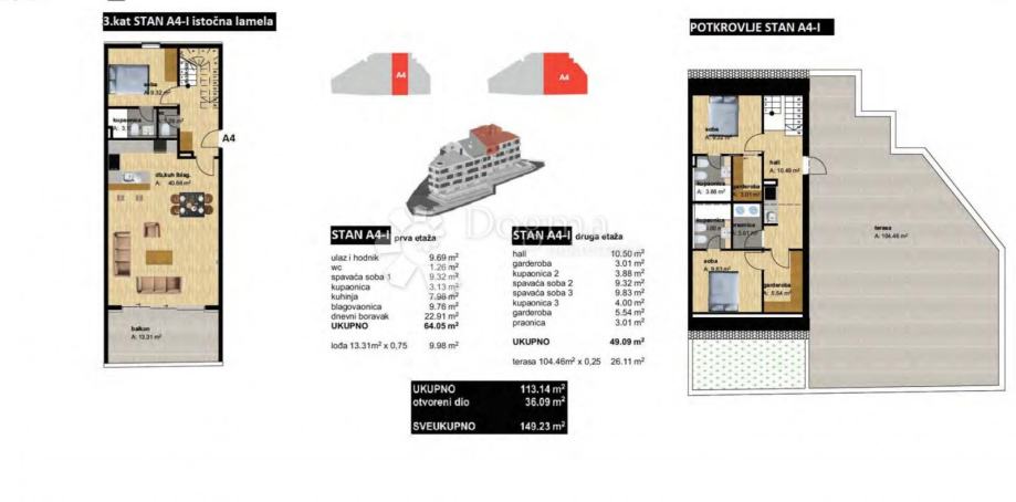 Druga Etaža: U potkrovlju se nalazi dodatni hodnik koji vodi do dvije prostrane spavaće sobe, svaka s vlastitom kupaonicom, garderobom i praonicom rublja. Vrhunac ovog doma je velika terasa od 104 m2 s nevjerojatnim pogledom na more i grad, idealna za uživanje u sunčanim danima i romantičnim večerima.