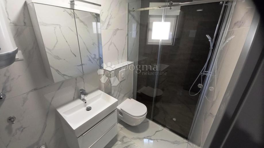 Prva etaža ove elegantne nekretnine nudi prostrani hodnik, udobnu spavaću sobu, kupaonicu i WC, te moderno opremljenu kuhinju, blagovaonicu i dnevni boravak. Prostrana lođa pruža predivan pogled na grad i beskrajno plavetnilo Jadranskog mora.