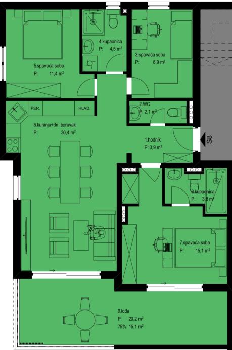 - Lođa: 20,19 m2 (koef. 0,75 – korisna vrijednost 15,14 m2)