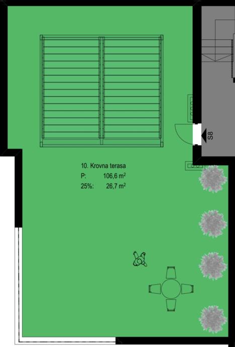 Prodaje se trosobni penthouse S8 s prostranom krovnom terasom, smješten na drugom katu moderno uređenog zatvorenog naselja City Garden. Projekt je razvijen s naglaskom na sigurnost, privatnost i visoku kvalitetu stanovanja, idealan za obiteljski život.