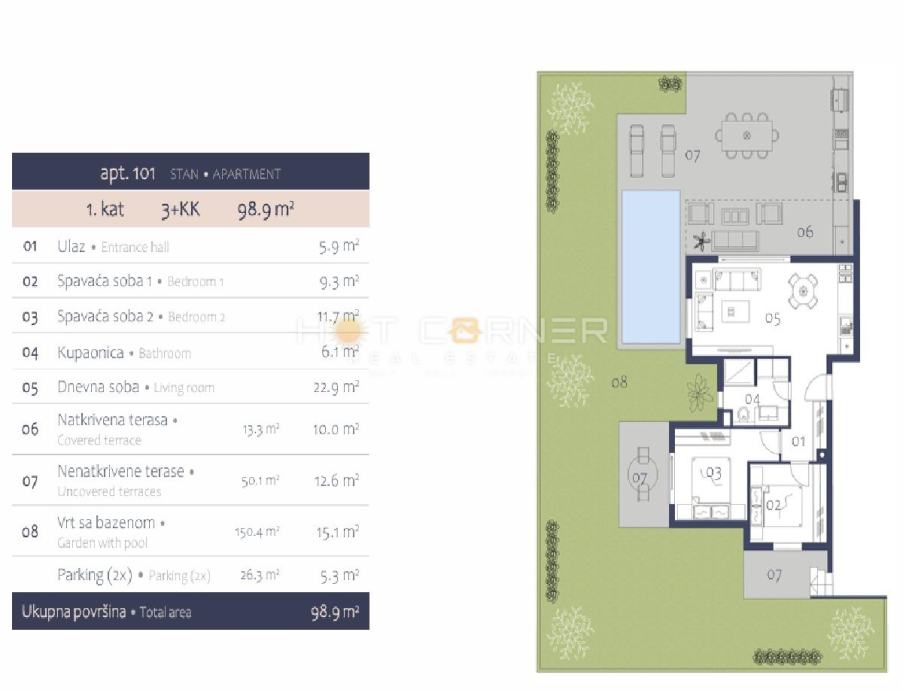 stanovi u prizemlju imati u vlasništvu pripadajući vrt, te vanjski bazen.