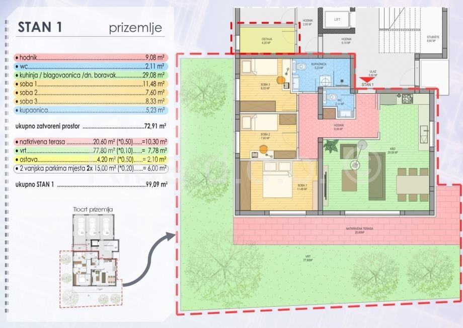 Ukupna neto površina stana bez pripadaka je 72,91 m2, a s pripatcima ukupna površina je 99,09m2.