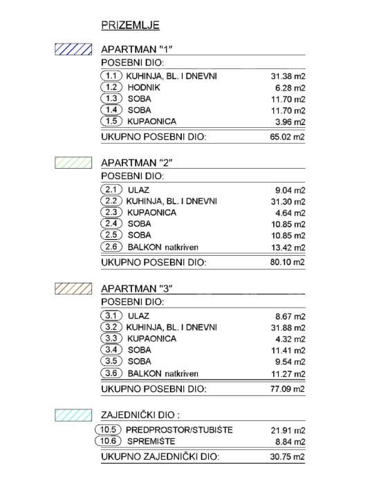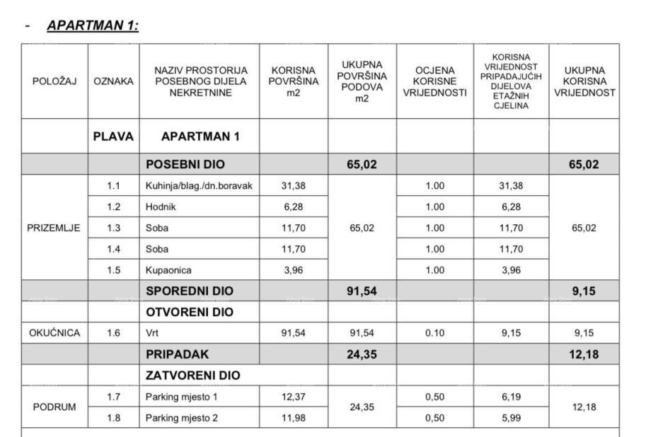 Apartman 1 nalazi se u prizemlju zgrade i sastojat će se od hodnika, kuhinje sa dnevnim boravkom i blagavaonicom, 2 spavaće sobe i kupaonice.