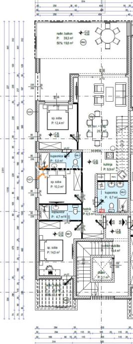 Radi se o stanu na 2. katu zgrade. Raspored prostorija čine hodnik, spavaća soba, dvije spavaće sobe s kupaonicama, kupaonica, kuhinja s blagovaonicom i dnevnim boravkom, te dvije natkrivene terase. Iz stana se izlazi na krovnu terasu površine 155,60 m2 na kojoj će biti montažni bazen površine cca 10-15 m2. Ukupna neto površina opisanih prostorija iznosi 169,47 m2.