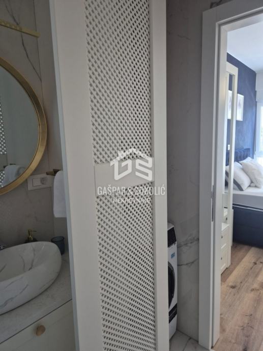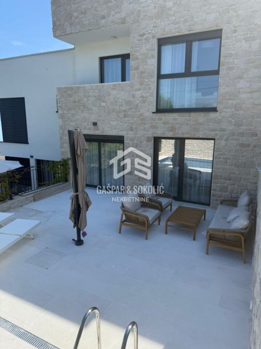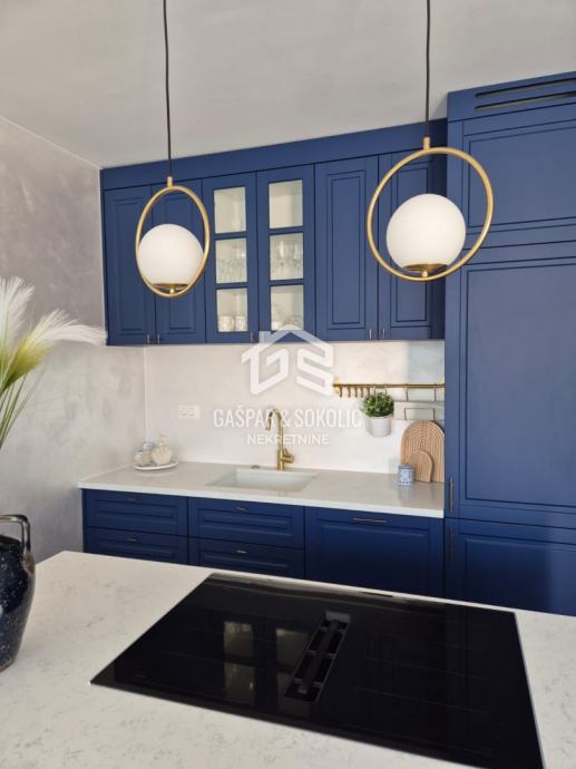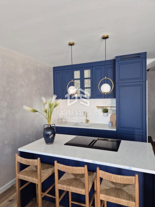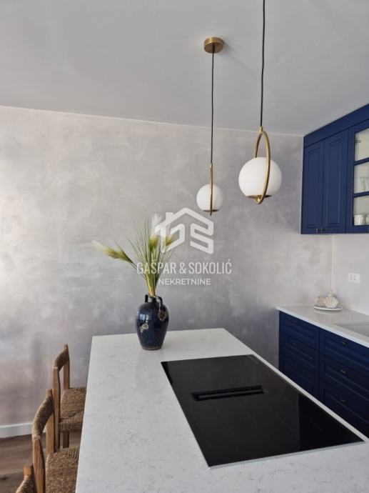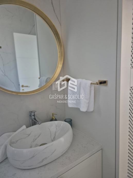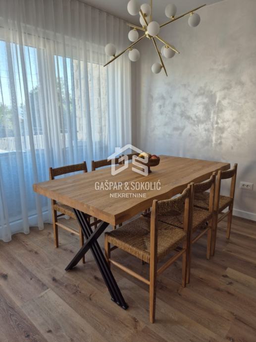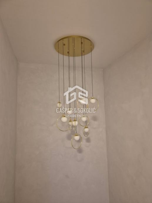 U ponudi za prodaju je luksuzan dvoetažni stan sa vlastitim dvorištem i bazenom, na prelijepoj poziciji u Lovranu. Udaljenost objekta od mora i plaže je nešto manje od 300m, dok je centar Lovrana na udaljenosti od 1km. Iz objekta se pruža lijep pogled na more i Kvarner.