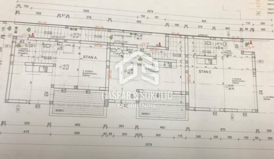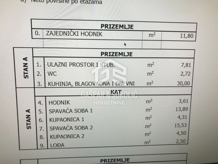 Stan A sastoji se od ulaznog prostora, stubišta, toaleta i ˝open space˝kuhinje, dnevnog boravka i blagovaone u prizemlju, te hodnika, stubišta, lođe, dvije spavaće sobe sa vlastitim kupaonicama na katu. Neto korisna površina zatvorenog dijela stana iznosi 91,10 m2, dok okoliš (vrt, bazen, parkirno mjesto vanjsko) čine 67,40 m2 , u cijelosti iznosi stan+okoliš 158,50 m2.