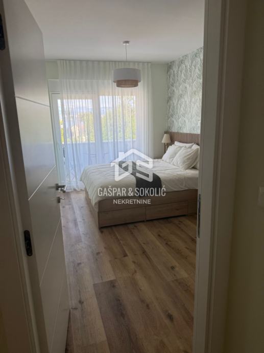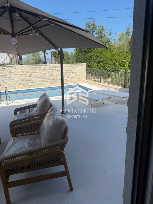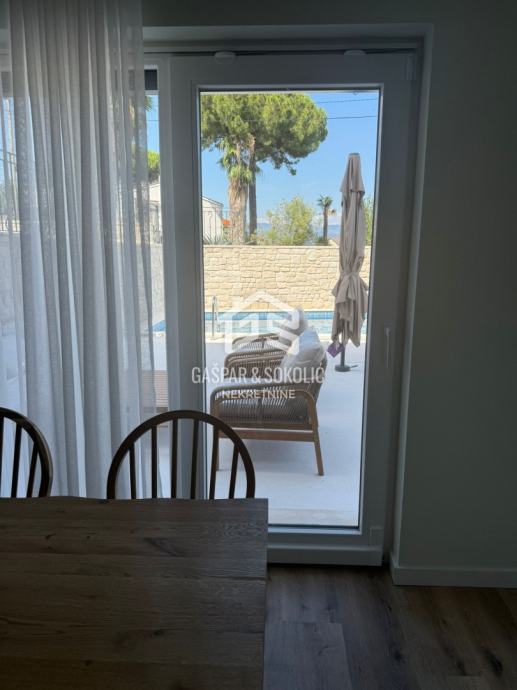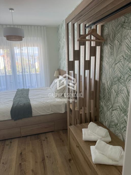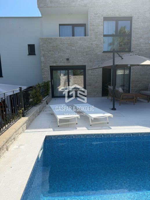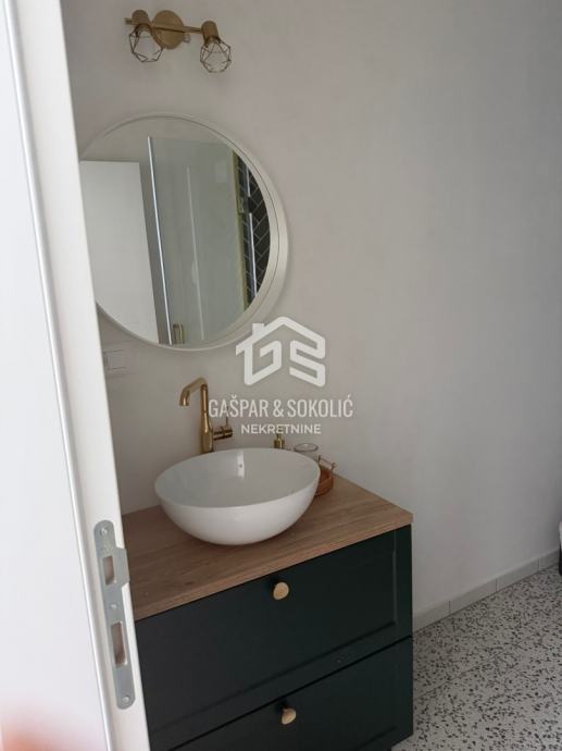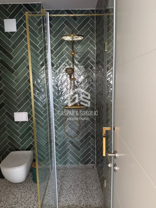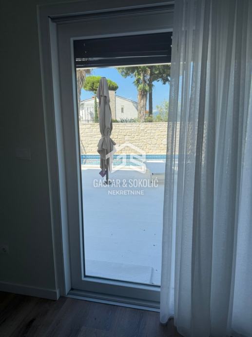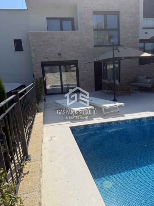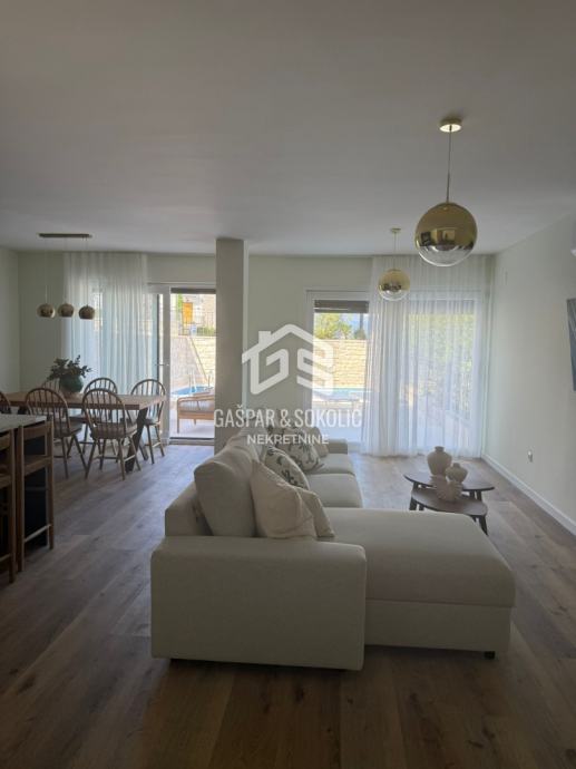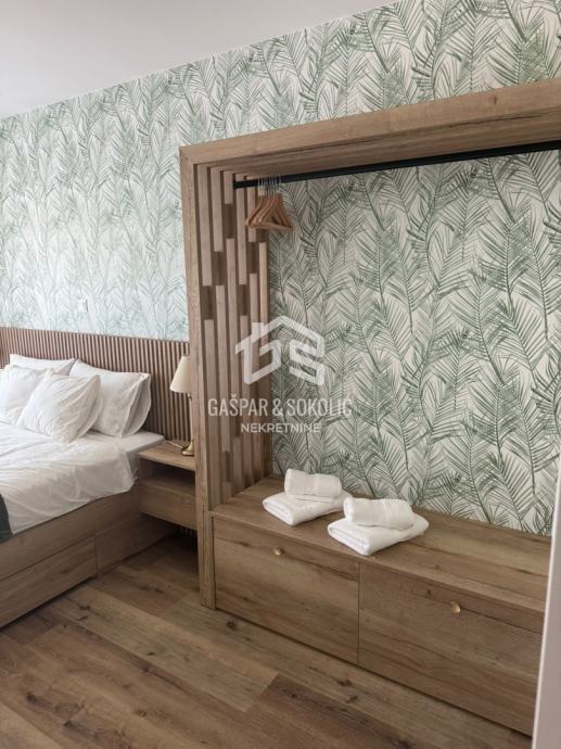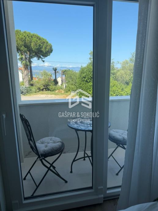 U ponudi za prodaju je luksuzan dvoetažni stan sa vlastitim dvorištem i bazenom, na prelijepoj poziciji u Lovranu. Udaljenost objekta od mora i plaže je nešto manje od 300m, dok je centar Lovrana na udaljenosti od 1km. Iz objekta se pruža lijep pogled na more i Kvarner.