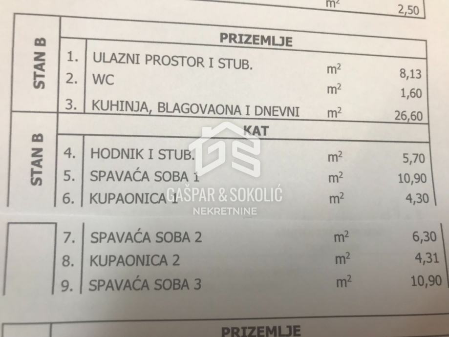 Stan B sastoji se od ulaznog prostora, stubišta, toaleta i ˝open space˝kuhinje, dnevnog boravka i blagovaone u prizemlju, te hodnika, stubišta, tri spavaće sobe sa vlastitim kupaonicama na katu. Neto korisna površina zatvorenog dijela stana iznosi 116,67 m2, dok okoliš (vrt, bazen, parkirno mjesto vanjsko) čine 74,30 m2 , u cijelosti iznosi stan+okoliš 190,97 m2.