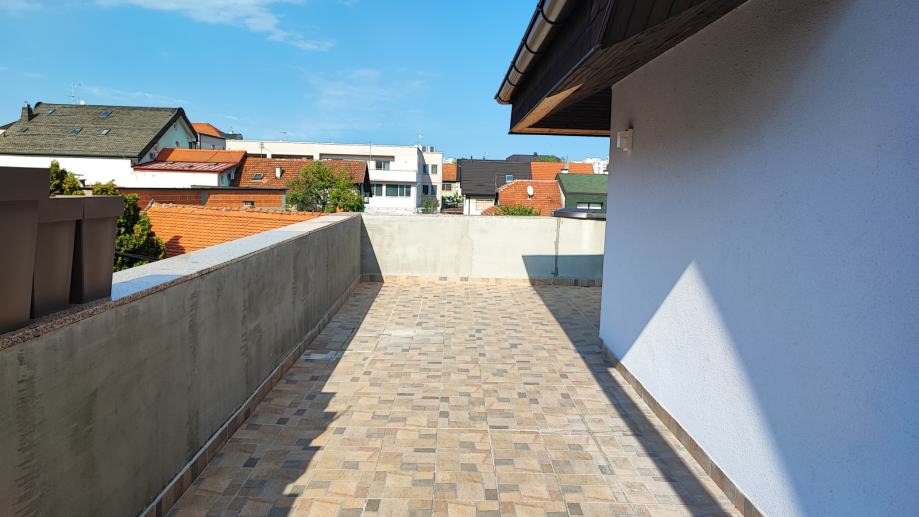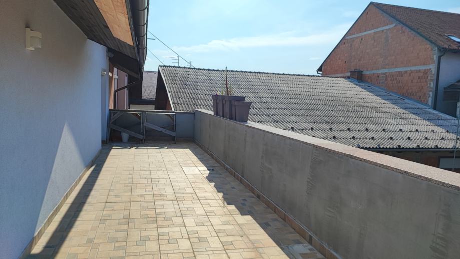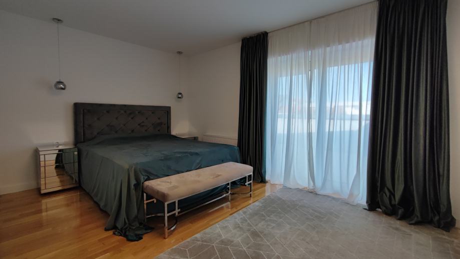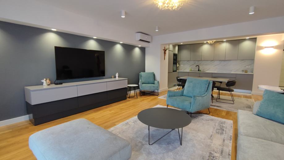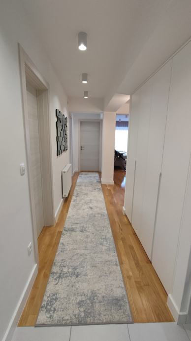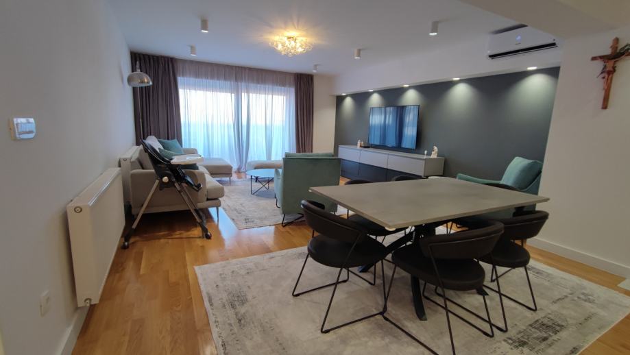 Sastoji se od dnevnog boravka sa kuhinjom i blagavaonicom, 3 spavaće sobe, hodnika, kupaonice, wc-a, ostave ,velike terase 70m2, loggie 4m2.