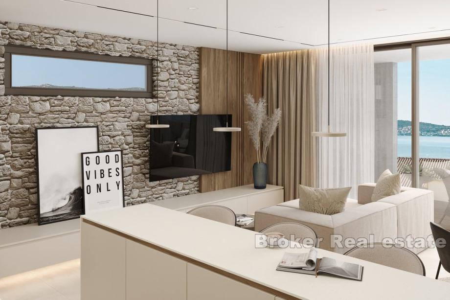 Ovaj novoizgrađeni stan smješten je u modernoj, visokokvalitetnoj zgradi koja se sastoji od samo tri ekskluzivna stana, idealno locirana u Rogoznici, na pješačkoj udaljenosti od centra grada i mora. Stan nudi zadivljujući panoramski pogled na more i izgrađen je prema najvišim standardima, koristeći vrhunske materijale, najsuvremeniju opremu i sofisticirani, po mjeri izrađeni namještaj.