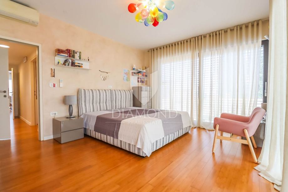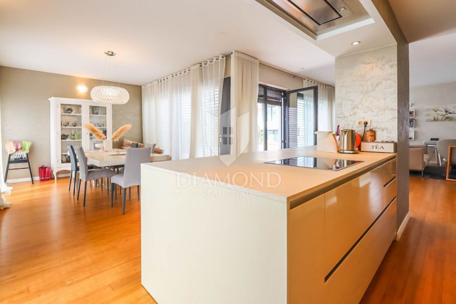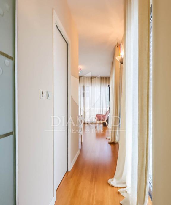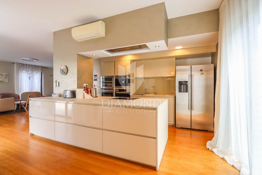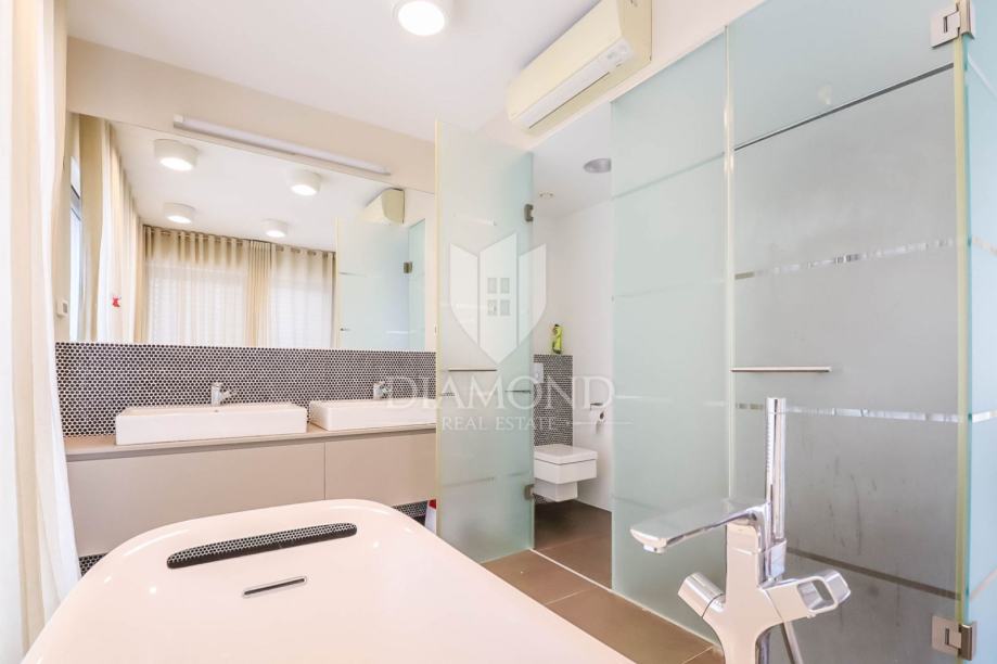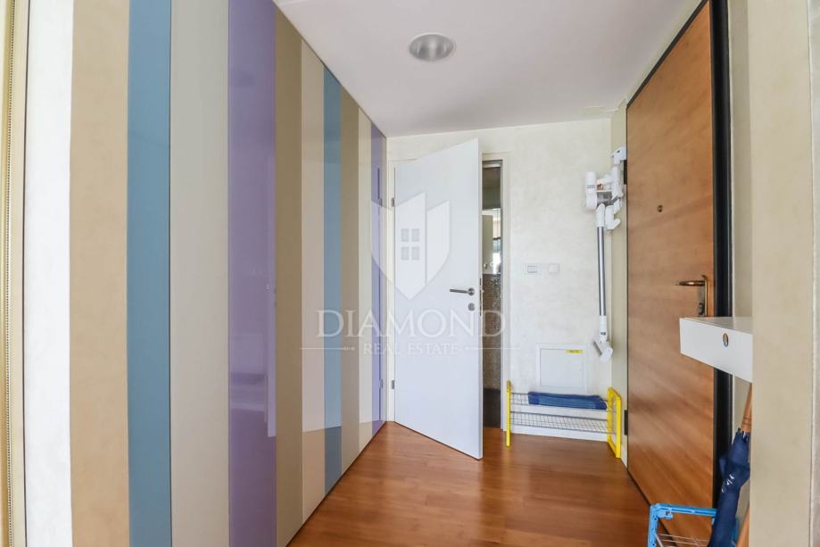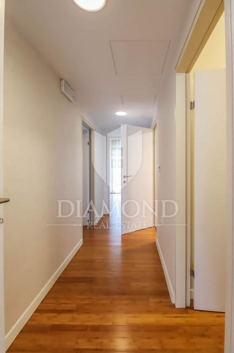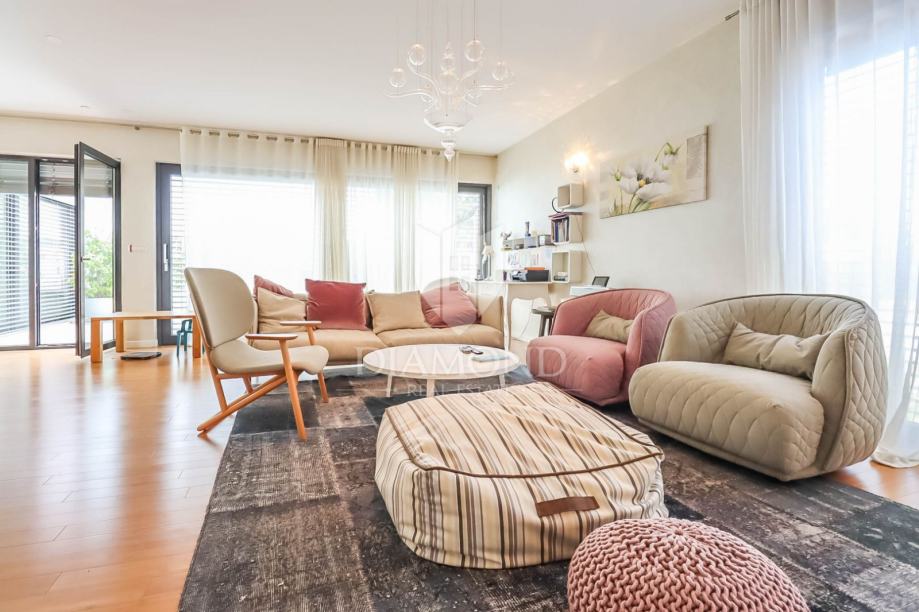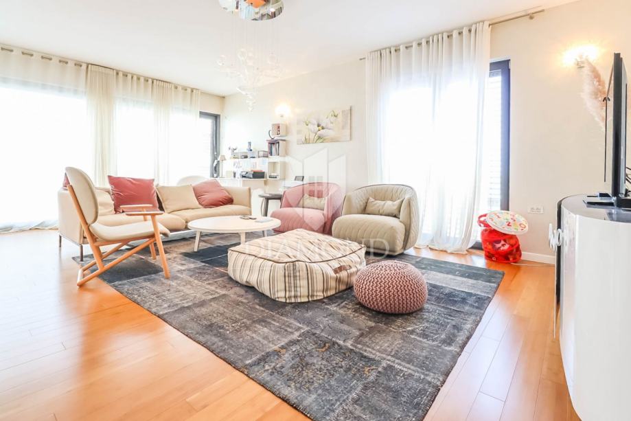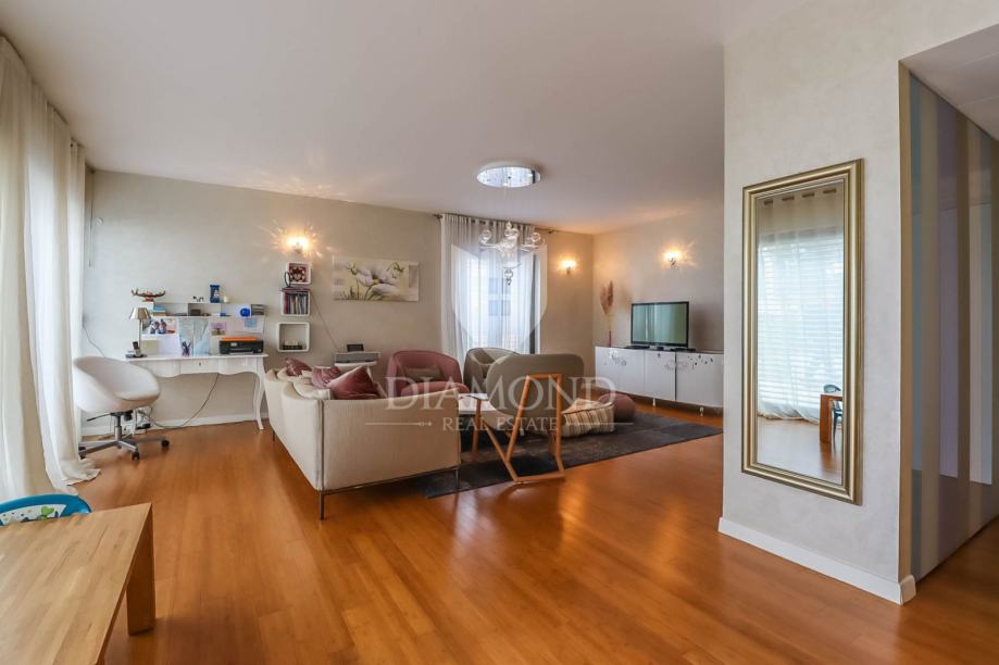 Ovaj prostrani stan nalazi se na drugom katu nove i moderne zgrade koja je izgrađena 2012. te se proteže na 166.97m2 sa pripadajućom terasom od 26m2. Sastoji se od ulaznog hodnika koji nas vodi u dnevni dio koji je spojen sa blagovaonicom i kuhinjom iz kojeg se izlazi na već spomenutu terasu. U nastavku stana nalaze se tri spavaće sobe i tri kupaonice. Prva spavaća soba trenutno ima funkciju gostinjske sobe i pristup kupaonici koja se nalazi u hodniku. Druga spavaća soba ima vlastitu kupaonicu na korištenje dok treća ujedno i najveća spavaća soba ima en-suite kupaonicu. Uz ovaj stan prodaje se i jedno parkirno mjesto u sklopu zajedničke garaže.
