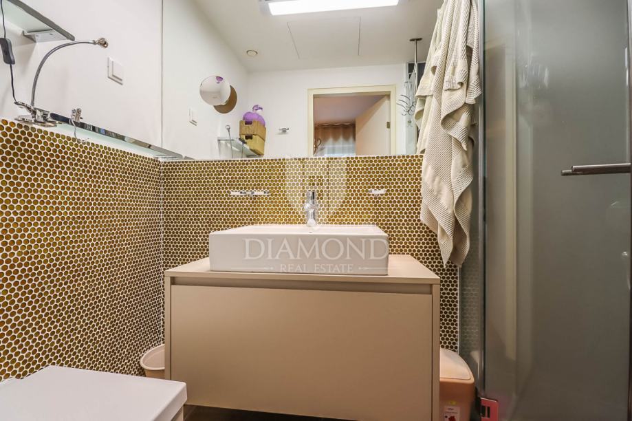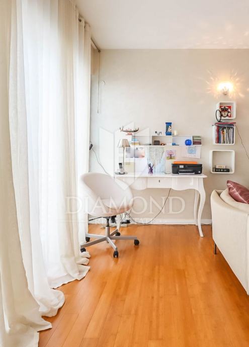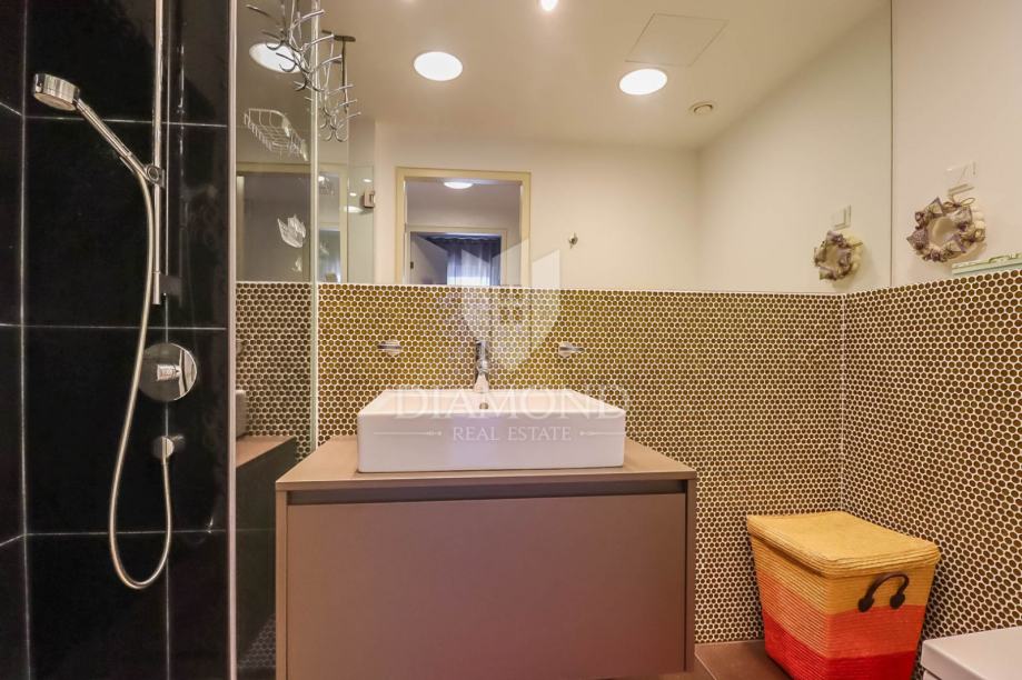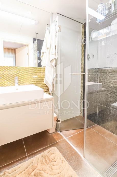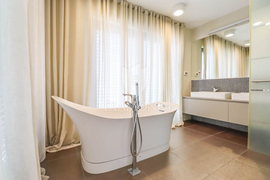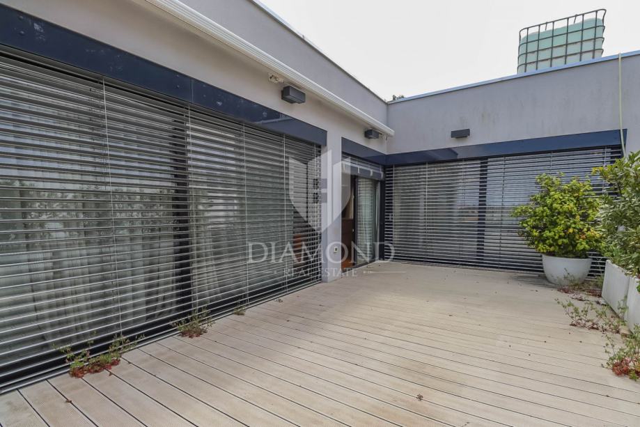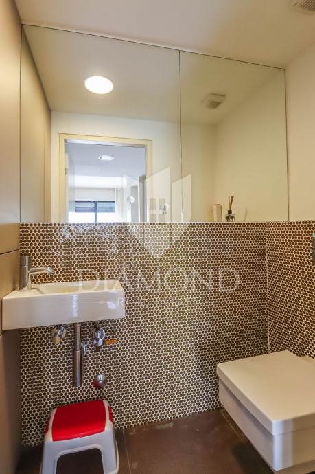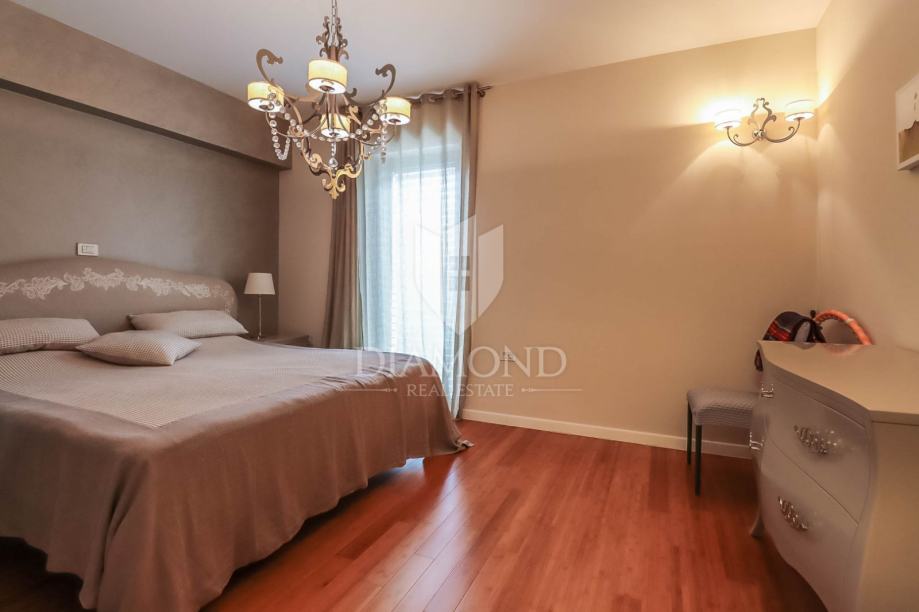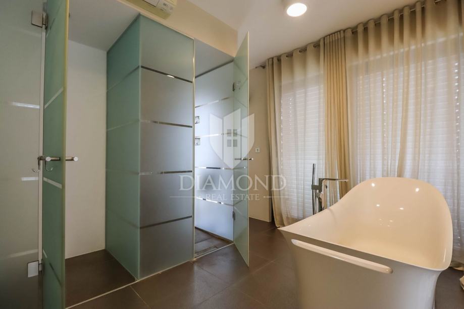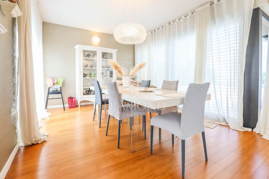 Ovaj prostrani stan nalazi se na drugom katu nove i moderne zgrade koja je izgrađena 2012. te se proteže na 166.97m2 sa pripadajućom terasom od 26m2. Sastoji se od ulaznog hodnika koji nas vodi u dnevni dio koji je spojen sa blagovaonicom i kuhinjom iz kojeg se izlazi na već spomenutu terasu. U nastavku stana nalaze se tri spavaće sobe i tri kupaonice. Prva spavaća soba trenutno ima funkciju gostinjske sobe i pristup kupaonici koja se nalazi u hodniku. Druga spavaća soba ima vlastitu kupaonicu na korištenje dok treća ujedno i najveća spavaća soba ima en-suite kupaonicu. Uz ovaj stan prodaje se i jedno parkirno mjesto u sklopu zajedničke garaže.