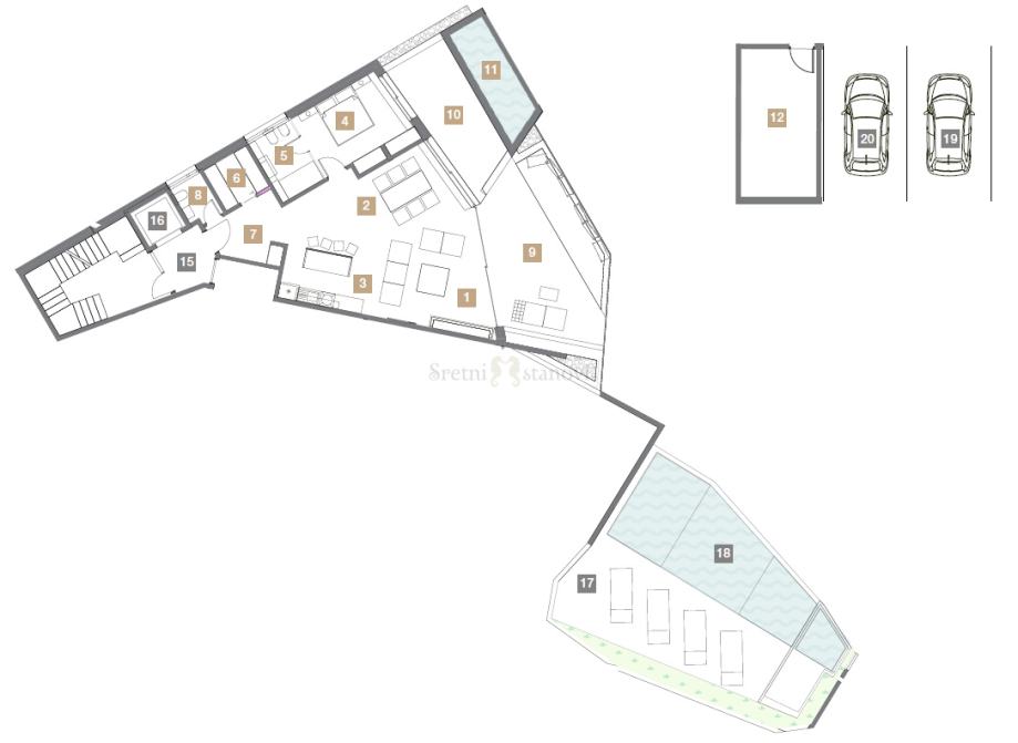 Stan se nalazi u prizemlju luksuzne novogradnje te nudi i dobro raspoređeni unutarnji prostor, a sastoji se od 1 spavaće sobe s privatnom kupaonicom, hodnika, garderobe, wc-a i dnevnog boravka s blagovaonicom i kuhinjom. Stan ima pripadajuću okućnicu u sklopu koje se nalazi i privatni bazen. Kvadratura stambenog dijela stana iznosi 95,62 m2, a okućnice 64,00 m2.