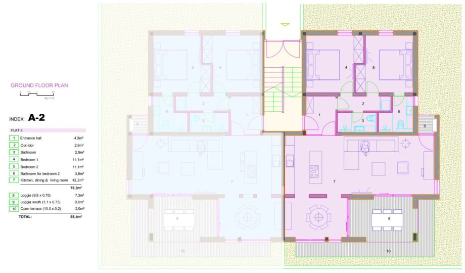 Prostrani unutrašnji prostor od 78 m² ima obilje dnevnog svjetla i odlično organiziran raspored - posebno se ističe raskošan dnevni dio s direktnom vezom na eksterijer; za životni stil u blizini mora.