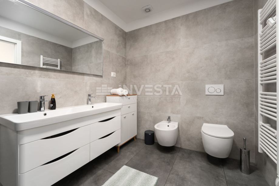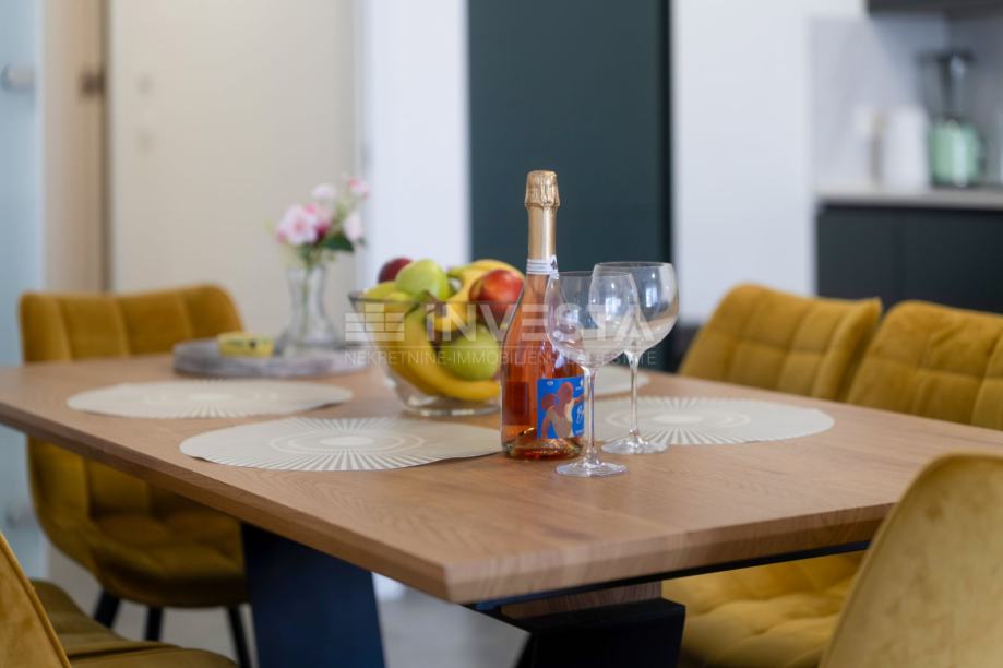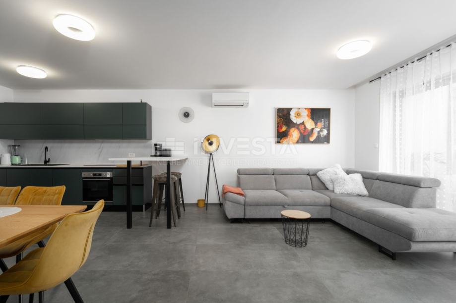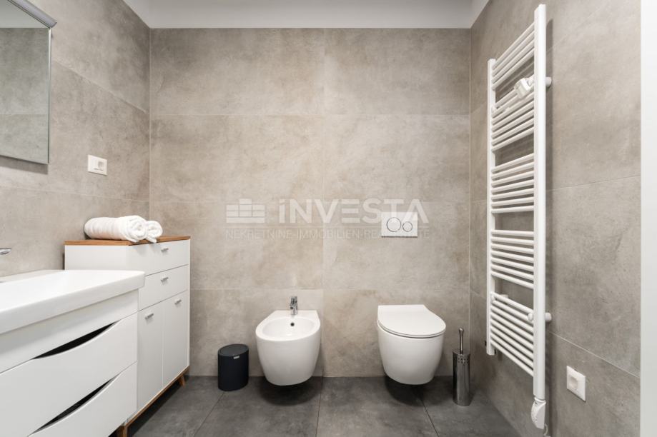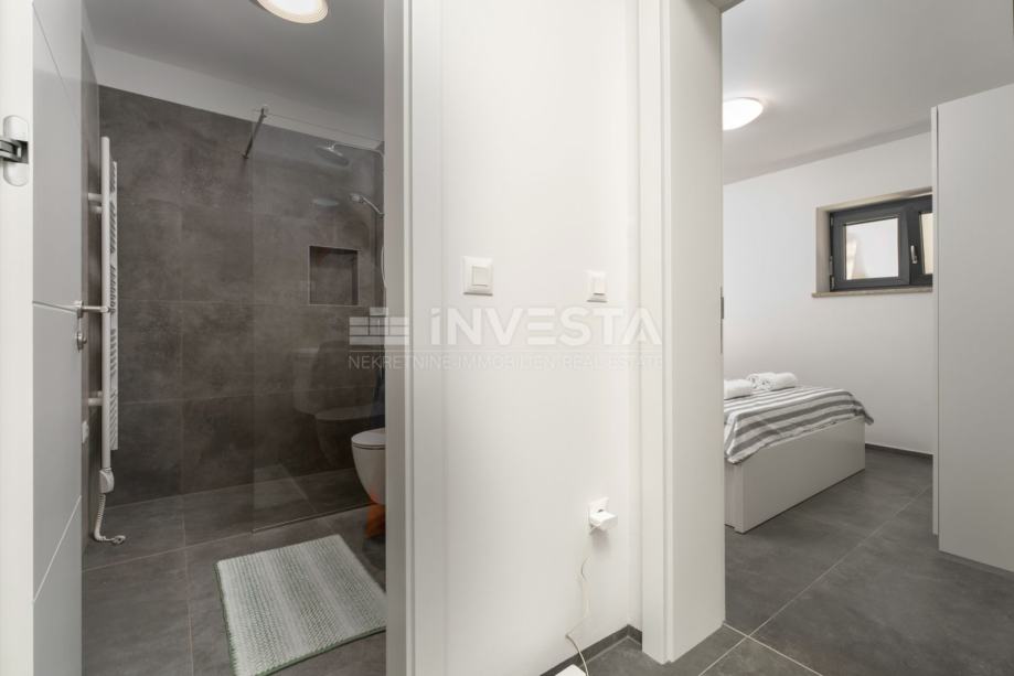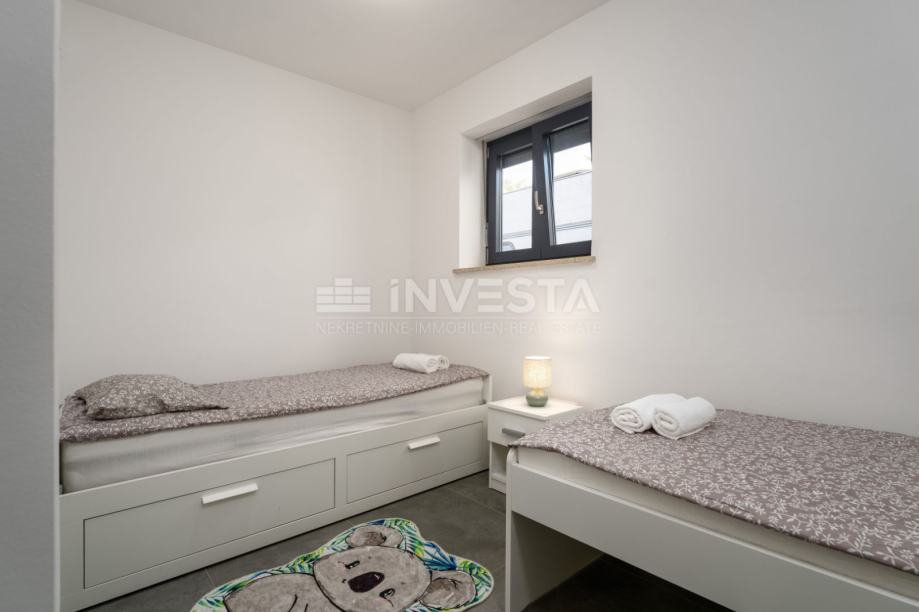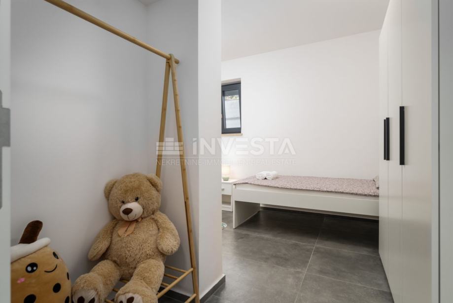 U mirnom i uređenom dijelu manjeg ribarskog gradića nedaleko Poreča, u prizemlju moderne stambene zgrade izgrađene 2022. godine, smješten je ovaj iznimno kvalitetan i komforan stan, udaljen svega 700 metara od mora i obale.