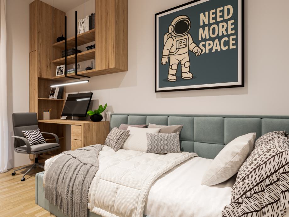The highlight is the master bedroom, featuring its own private balcony, a dedicated workspace, and an unbeatable view of the sea – an ideal spot for relaxation or inspired remote work.