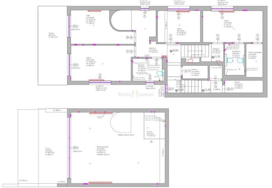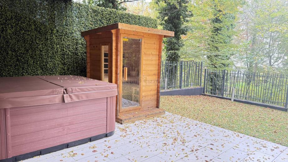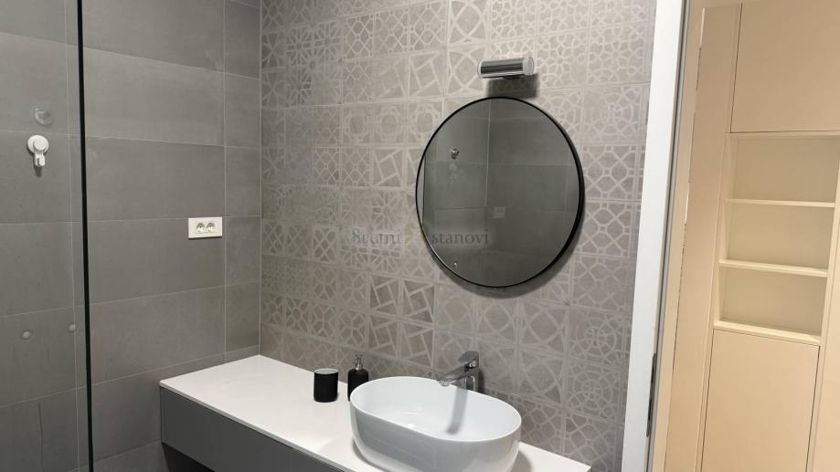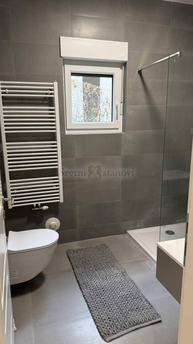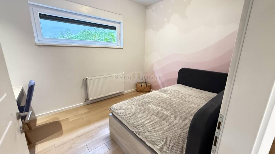 Gornja etaža sastoji se od hodnika, 3 spavaće sobe, 2 kupaone, balkona i radnog prostora iz kojeg se modernim stubištem spušta na donju etažu. Donja etaža je kompletno open-space te se u njoj nalazi veliki dnevni boravak s kuhinjom i blagavaonom. Iz dnevnog boravka se kroz veliku kliznu stijenu izlazi na prostranu, djelomično natkrvenu terasu s privatnom i ograđenom okućnicom od 60m2, gdje je privatnost zagarantirana prirodom koja ju okružuje.