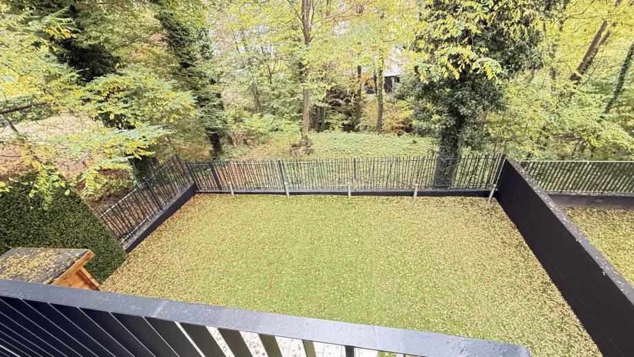 The upper floor consists of a hall, 3 bedrooms, 2 bathrooms, a large balcony and a working space from which a modern staircase leads down to the lower floor. The lower floor is completely open-space and there is a large living room with kitchen and dining area. The living room is full of light thanks to a large glass wall which leads to a spacious, partially covered terrace with fenced yard, where privacy is guaranteed by the nature that surrounds it.