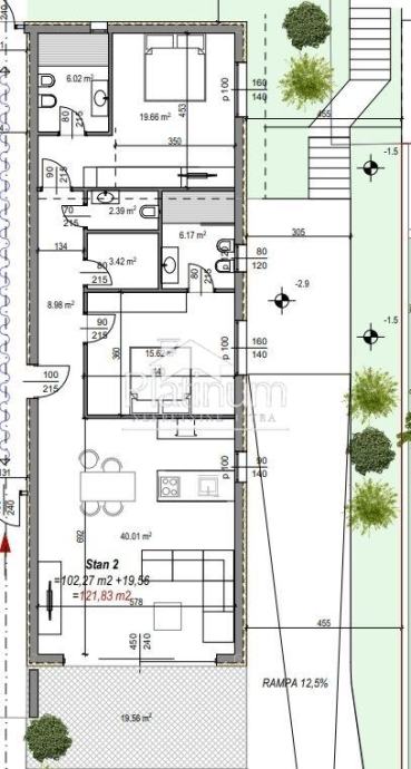 Stan se sastoji od 121,83 m2 iz kojeg se izlazi u vrt površine 40 m. Ima dvije spavaće sobe svaka sa svojom kupaonicom i garderobom.