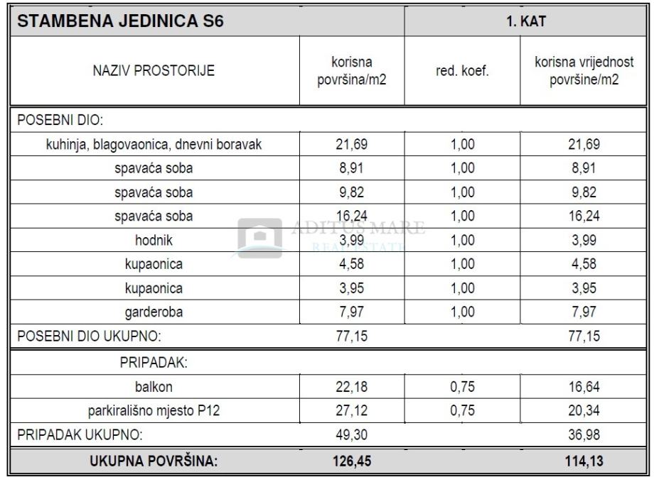 3 spavaće sobe, 2 kupaonice, terasa + garažno mjesto.