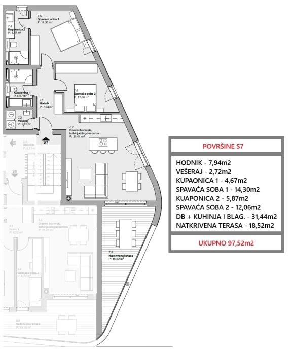 Stan S7 nalazi se na drugom katu, jugoistočno orijentiran, te se sastoji od: