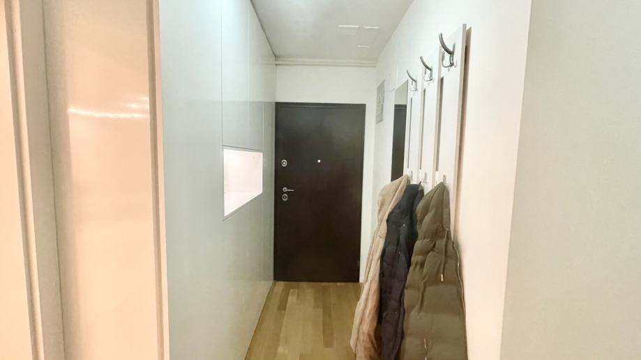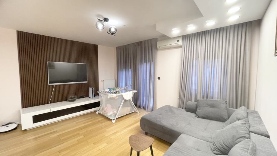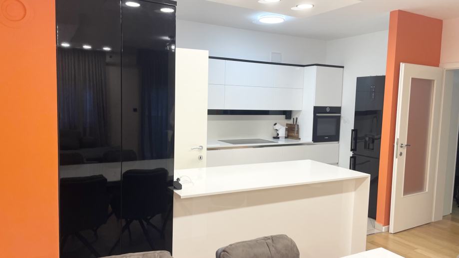 Stan se sastoji od ulaznog hodnika s predivno iskorištenim prostorom (ugradbeni ormari), kupaonica walk-in prostor za tuširanje, gostinjskog wc-a, otvorenog prostora koji sadrži: novu kuhinju( s izbom) blagovaonicu te dnevnu sobu sa izlazom na terasu 7m2, dvije spavaće sobe.