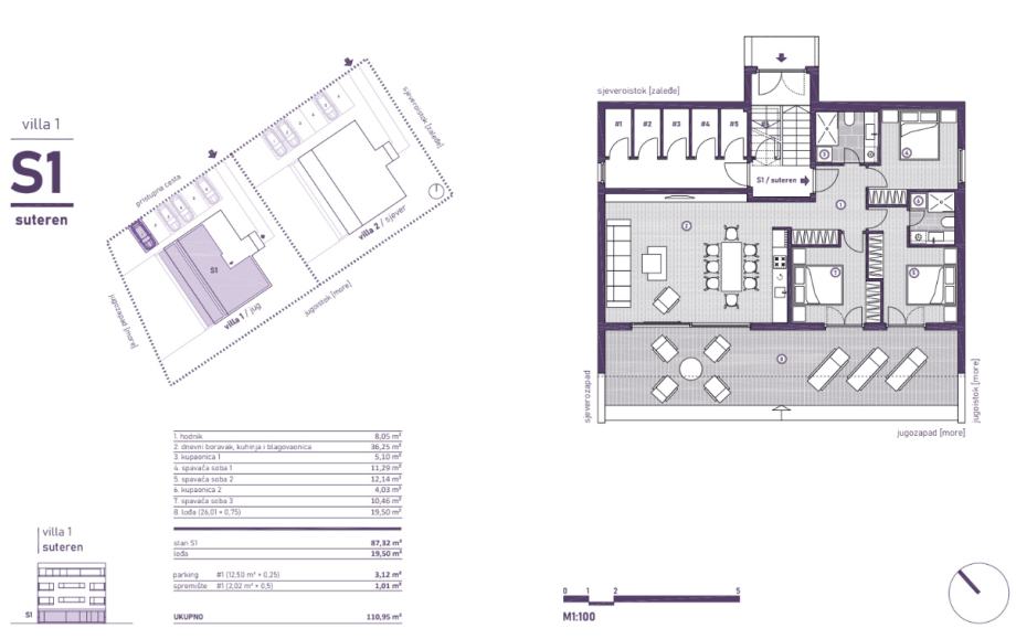 Jedan od istaknutih stanova u ovom projektu je Stan S1, smješten u suterenu vile 2, ukupne neto površine od 110,95 m2. Stan je južne orijentacije, što omogućava obilje prirodnog svjetla tijekom cijelog dana. Raspored stana osmišljen je kako bi pružio maksimalnu udobnost i funkcionalnost. Prostrani otvoreni prostor uključuje moderno uređenu kuhinju, blagovaonicu i dnevni boravak, stvarajući idealan ambijent za obitelj i druženja. Stan također sadrži tri udobne spavaće sobe te dvije potpuno opremljene kupaonice.