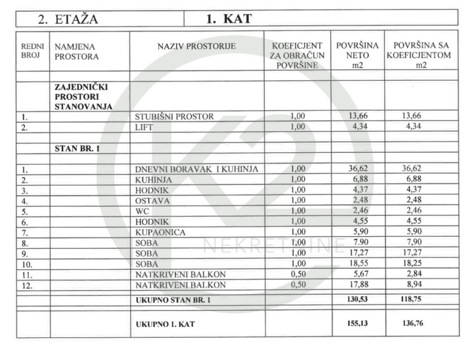 Stan na prvom katu ukupne površine 131,25 m2 sastoji se od: