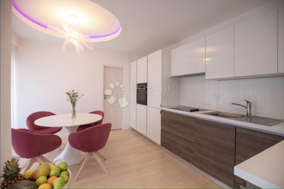 Kuhinja je dizajnirana s naglaskom na detalje: šank s rasvjetom, barske stolice, ugrađena perilica, hladnjak, pećnica i filter za vodu, te blagovaonski stol s dizajnerskim lusterom.