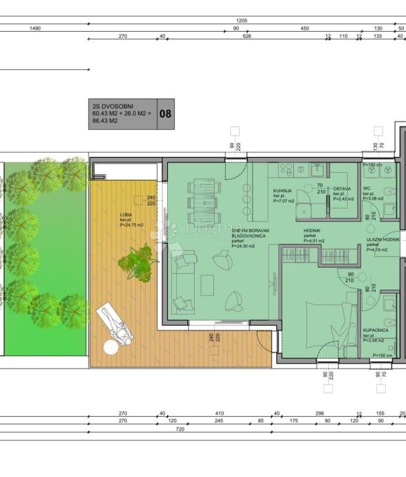 Posebnu vrijednost čini prostrana lođa površine 26,00 m², zamišljena kao privatna vanjska dnevna zona – produžetak životnog prostora s pogledom na zelenilo i prirodno okruženje (obračunava se dodatno), prema tlocrtu broj 08.