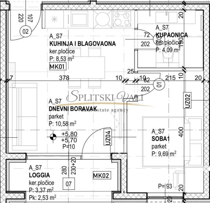 STAN S7 položen je na drugom katu stambene zgrade, prostire se na 42,49 m2, a sastoji se od kuhinje s blagovaonicom, jedne sobe, dvije spavaće sobe, kupatila i 4 m2 loggie.