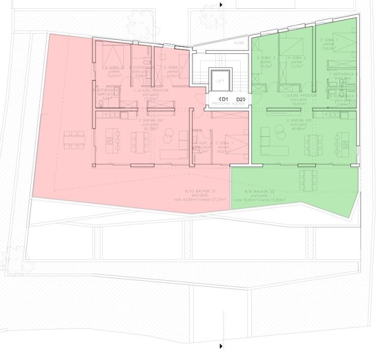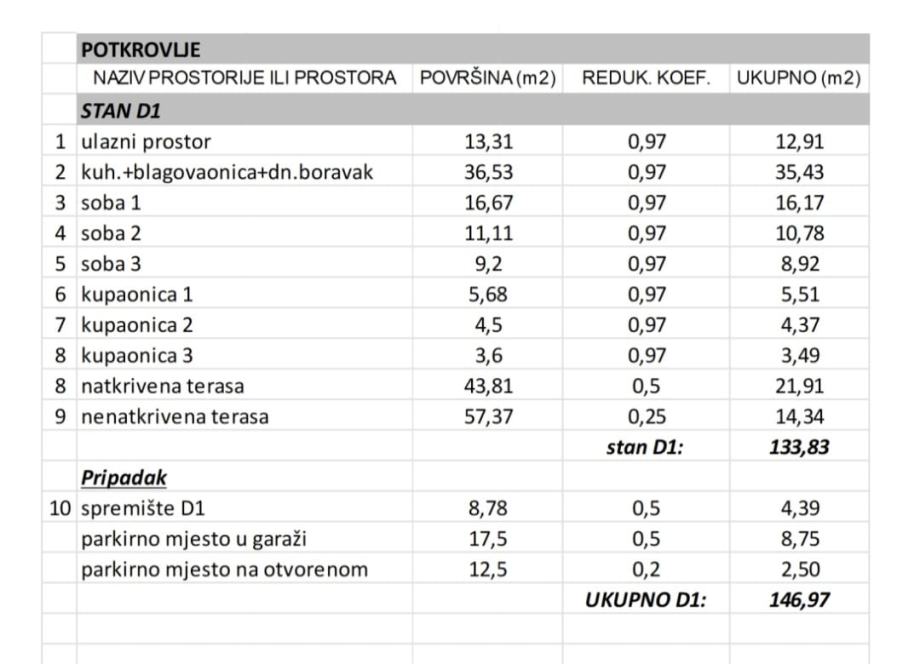 Stan D1 ističe se izuzetno funkcionalnim rasporedom i velikim vanjskim prostorom koji uključuje natkrivenu i nenatkrivenu terasu, s kojih se pruža prekrasan pogled na more. Ukupna neto korisna površina 146,97 m2. Stan se sastoji od ulaznog prostora, tri prostrane spavaće sobe, tri kupaonice te otvorenog dnevnog prostora koji povezuje kuhinju, blagovaonicu i dnevni boravak, pružajući ugodan ambijent za svakodnevni život. Dodatnu vrijednost stanu daje spremište te vlastito garažno parkirno mjesto s pripremom za punjenje električnih vozila i dodatno vanjsko parkirno mjesto.