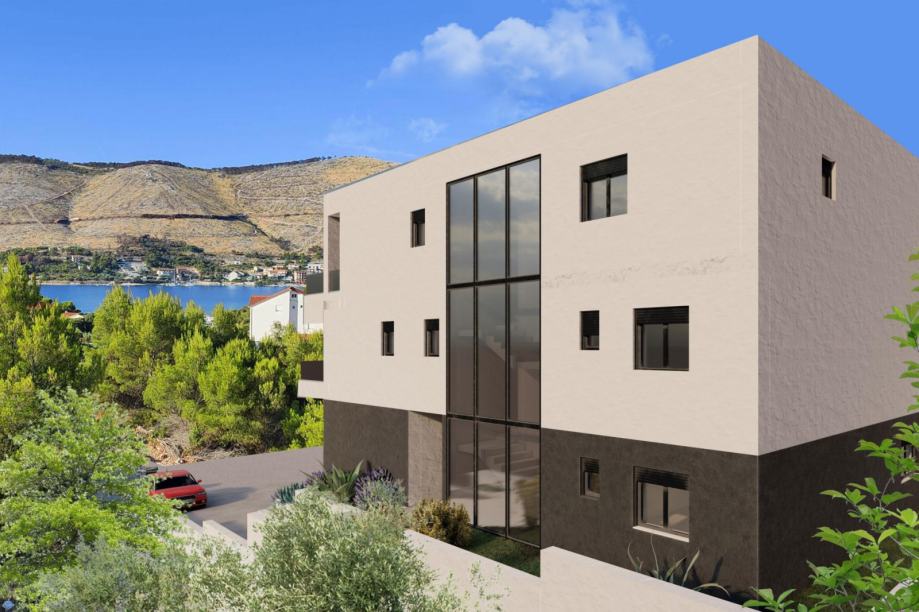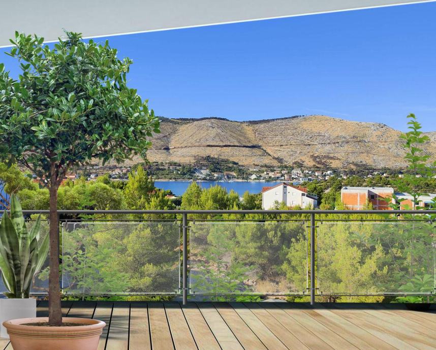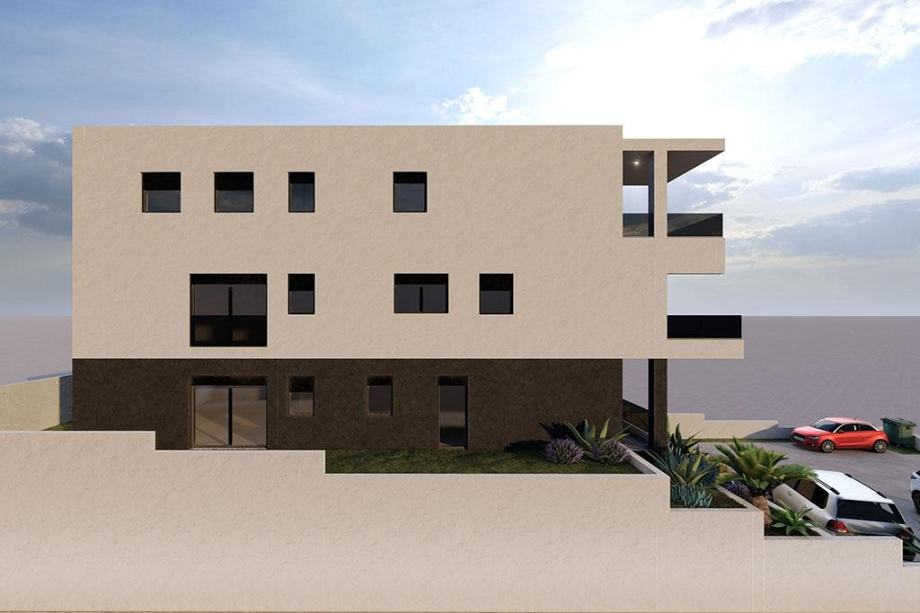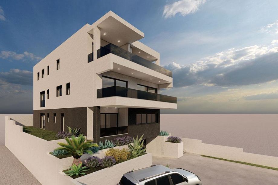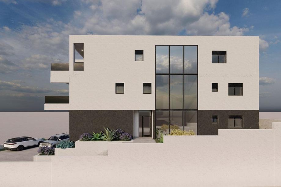 Prodaje se prostrani penthouse površine 135,45 m², smješten na drugom katu moderne novogradnje. Stan se sastoji od hodnika, prostranog dnevnog boravka (16,45 m²), kuhinje s blagovaonicom (32,55 m²), tri spavaće sobe (13,70 m², 12,65 m², 6,78 m²), dvije kupaonice (6,09 m² i 5,38 m²) te dodatnog WC-a (4,09 m²). Uz to, stan ima natkriveni balkon (15,88 m²) i nenatkriveni balkon (8,38 m²), koji pružaju predivan pogled na more. Stanu pripadaju dva garažna parkirna mjesta i spremište, a lift iz garaže vodi direktno u stan.