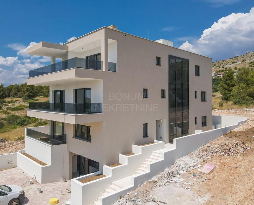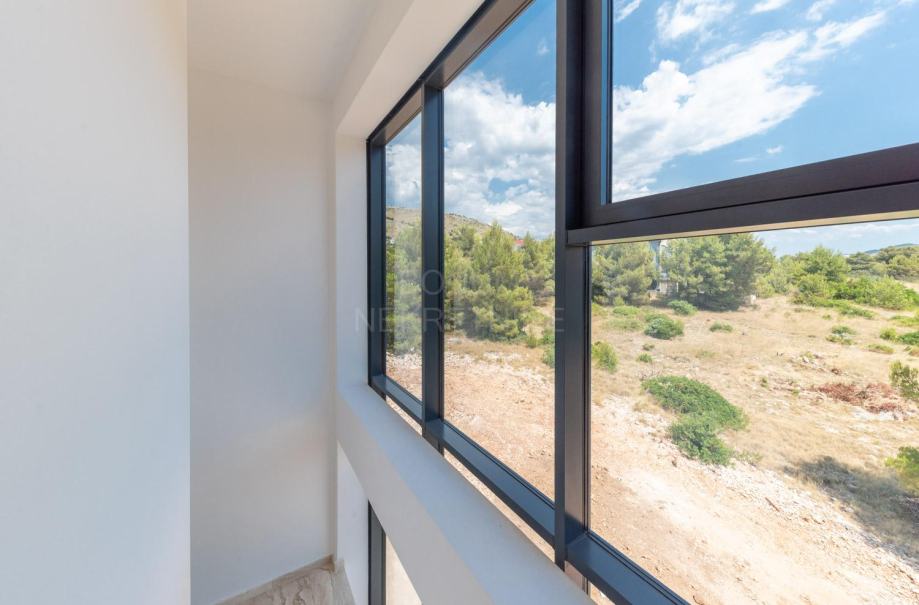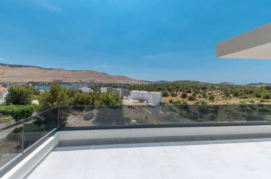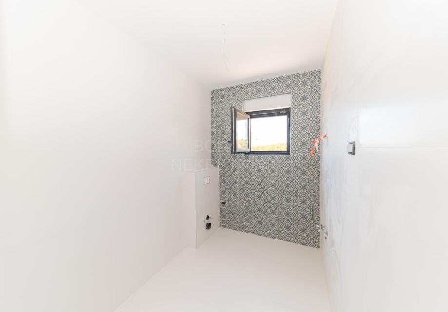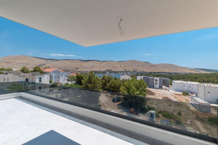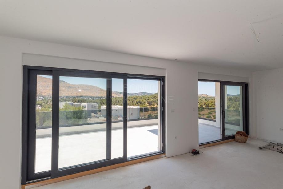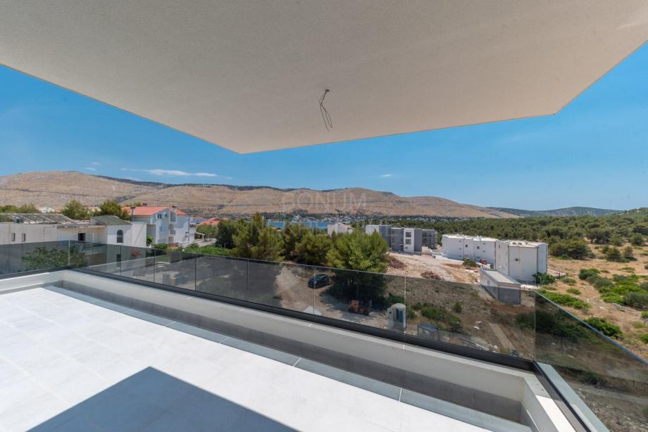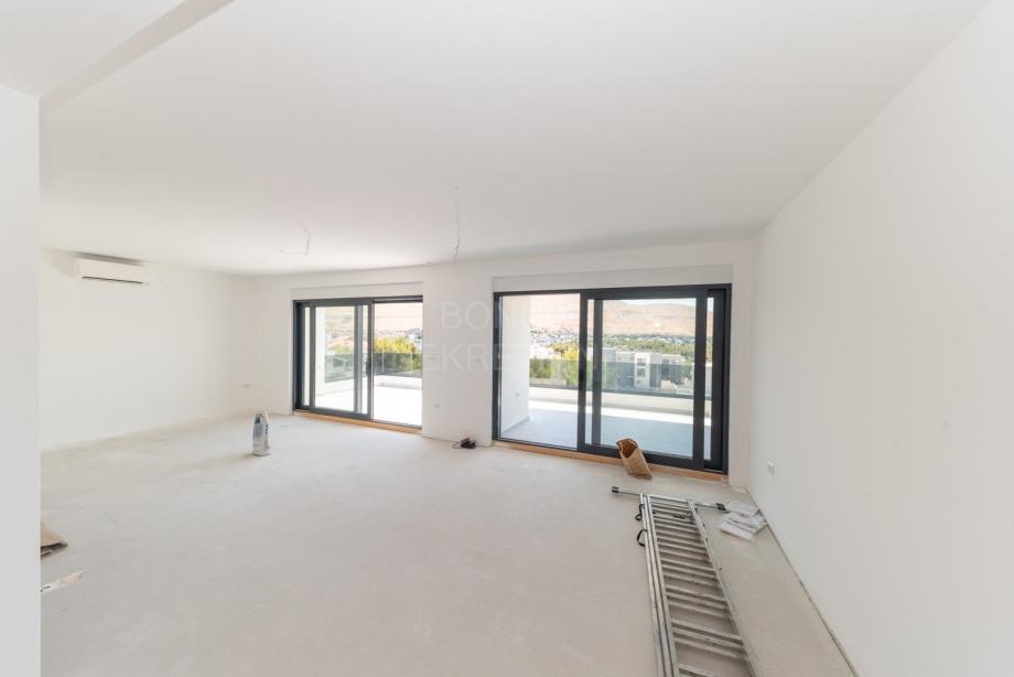 Prodaje se prostrani penthouse površine 135,45 m², smješten na drugom katu moderne novogradnje. Stan se sastoji od hodnika, prostranog dnevnog boravka (16,45 m²), kuhinje s blagovaonicom (32,55 m²), tri spavaće sobe (13,70 m², 12,65 m², 6,78 m²), dvije kupaonice (6,09 m² i 5,38 m²) te dodatnog WC-a (4,09 m²). Uz to, stan ima natkriveni balkon (15,88 m²) i nenatkriveni balkon (8,38 m²), koji pružaju predivan pogled na more. Stanu pripadaju dva garažna parkirna mjesta i spremište, a lift iz garaže vodi direktno u stan.